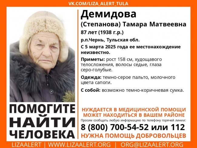 Волонтеры поискового отряда «ЛизаАлерт» разыскивают 87-летнюю Тамару Матвеевну Демидову (Степанову). Жительница поселка Чернь пропала 5 марта, и до сих пор информации о местонахождении пенсионерки нет.