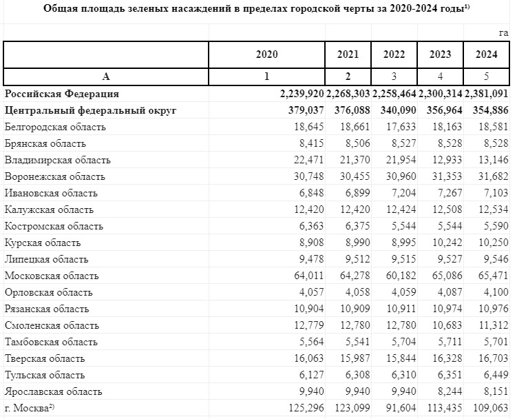 Больше всего зеленых насаждений в Москве — 109 063 гектара. На втором месте идет Московская область. Здесь площадь зеленых насаждений в пределах городской черты составляет 65 471 гектар. Замыкает тройку лидеров Воронежская область (31 682 гектара).