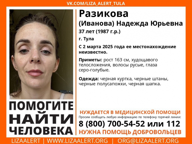 Волонтеры поискового отряда «ЛизаАлерт» разыскивают 37-летнюю Надежду Юрьевну Разикову (Иванову). Женщина пропала в Туле 2 марта, и до сих пор информации о ее местонахождении нет.