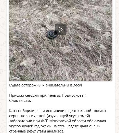 «Как сообщили наши источники в центральной токсико-серпетнологической (изучающей укусы змей) лаборатории при ФСБ Московской области, оба случая укусов людей гадюками на этой неделе дали очень странные результаты анализов», — говорится в сообщении.