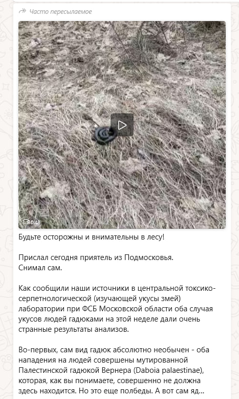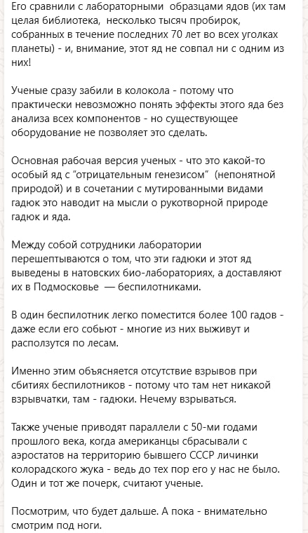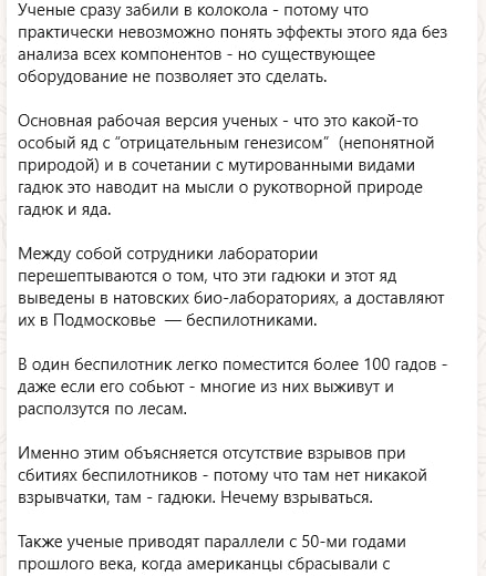 «Между собой сотрудники лаборатории перешептываются о том, что эти гадюки и этот яд выведены в натовских биолабораториях, а доставляют их в Подмосковье — беспилотниками», — утверждается дальше.