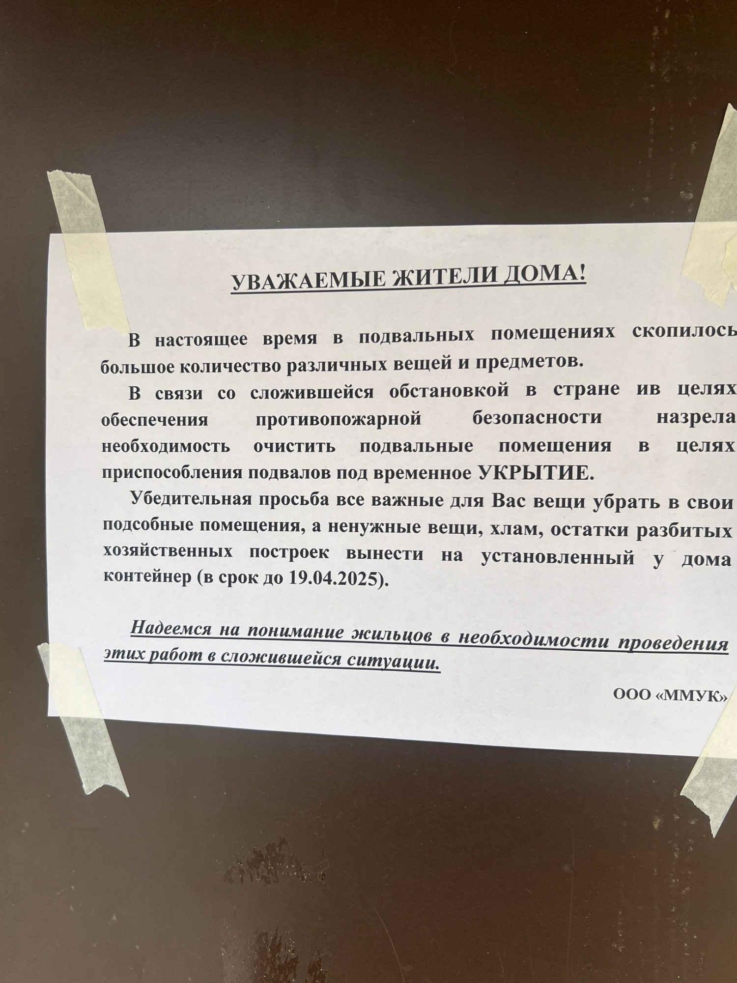 Сами жильцы убирать ничего не стали и получили предупреждение от УК. На двери подъезда появилось объявление, что нужные вещи собственники должны забрать, а все остальное — выкинуть. И желательно до 19 апреля.