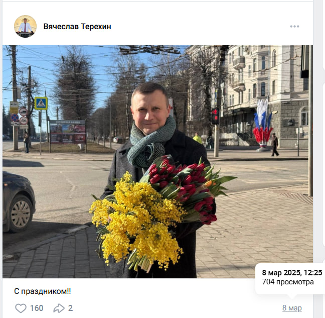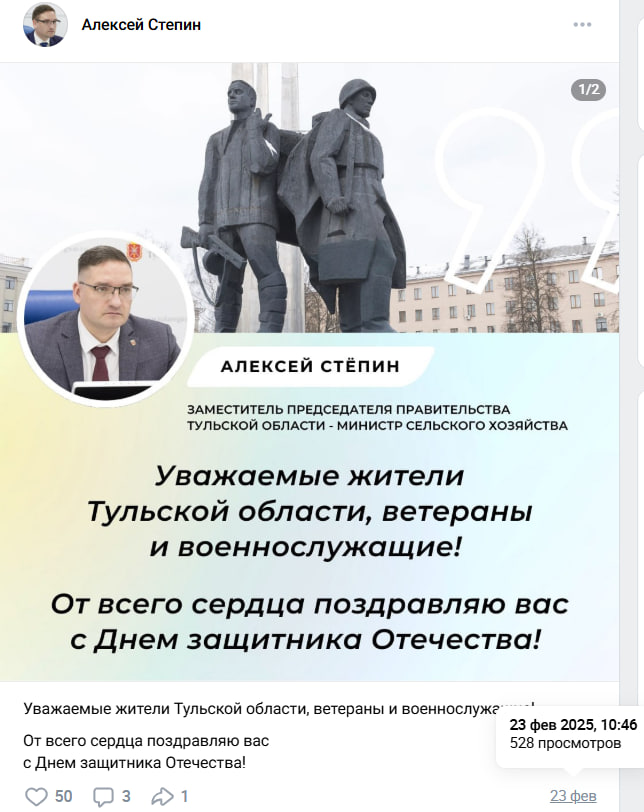 В оранжевой зоне также заместитель председателя правительства — министра сельского хозяйства, природных ресурсов и экологии Тульской области Алексей Степин. У него тоже две публикации — ко Дню защитника Отечества и к Международному женскому дню. Ждать множества реакций под шаблонными поздравлениями было бы слишком, однако несколько комментариев все же есть.