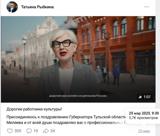 На втором месте — министр культуры и туризма Тульской области Татьяна Рыбкина. На ее странице все стабильно: работа, культура и снова работа, но при этом Татьяна Рыбкина экспериментирует с форматами. Комментарии у нее открыты, но аудитория не сильно большая.