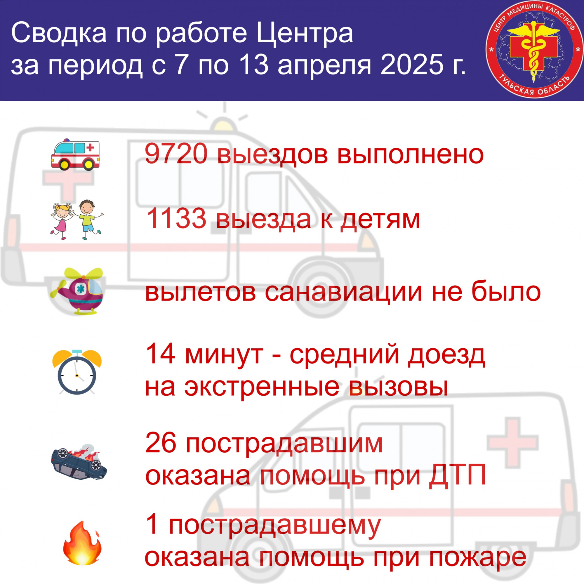 В Тульской области бригады скорой помощи совершили 9 720 выездов на прошлой неделе. Такие данные приводит территориальный центр медицины катастроф. Среднее время доезда составило 14 минут. В том числе, 1 133 выезда было совершено к детям.
