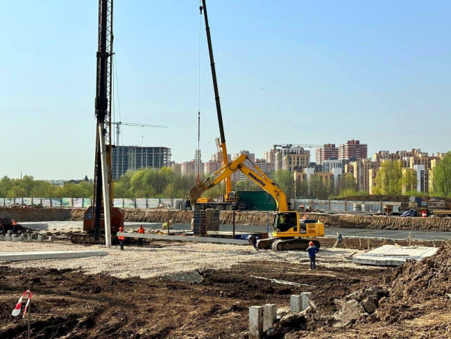 На площадке начались строительно-монтажные работы. Их ведут 34 человека и 12 единиц техники. Помимо этого, на стройке идут подготовительные и земляные работы, а также забивка свай.