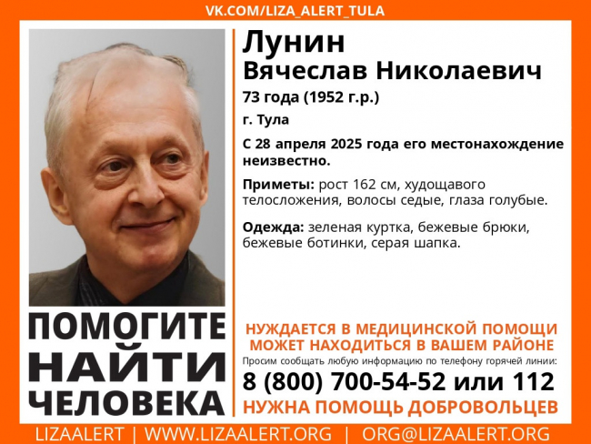 Волонтеры поискового отряда «ЛизаАлерт» второй день разыскивают 73-летнего Вячеслава Николаевича Лунина. Мужчина пропал в Туле 28 апреля, и о его местонахождении ничего не известно. Пенсионер нуждается в медицинской помощи.