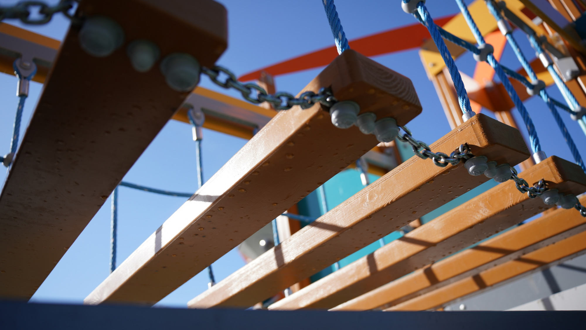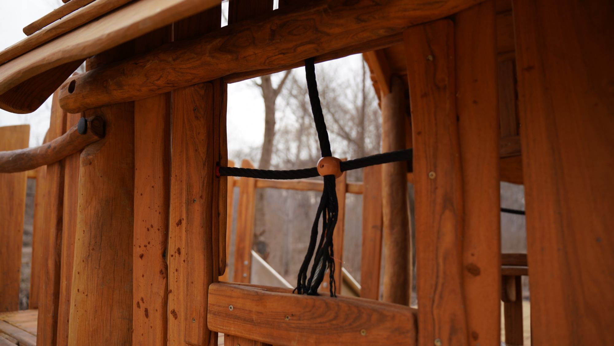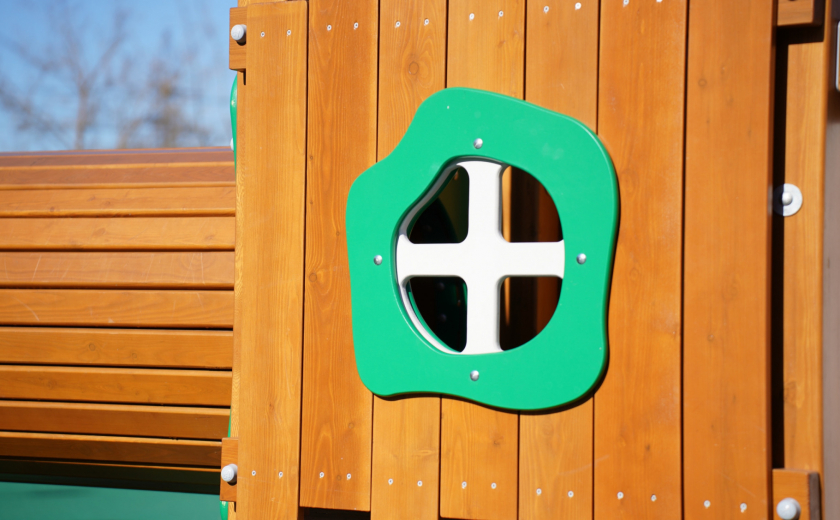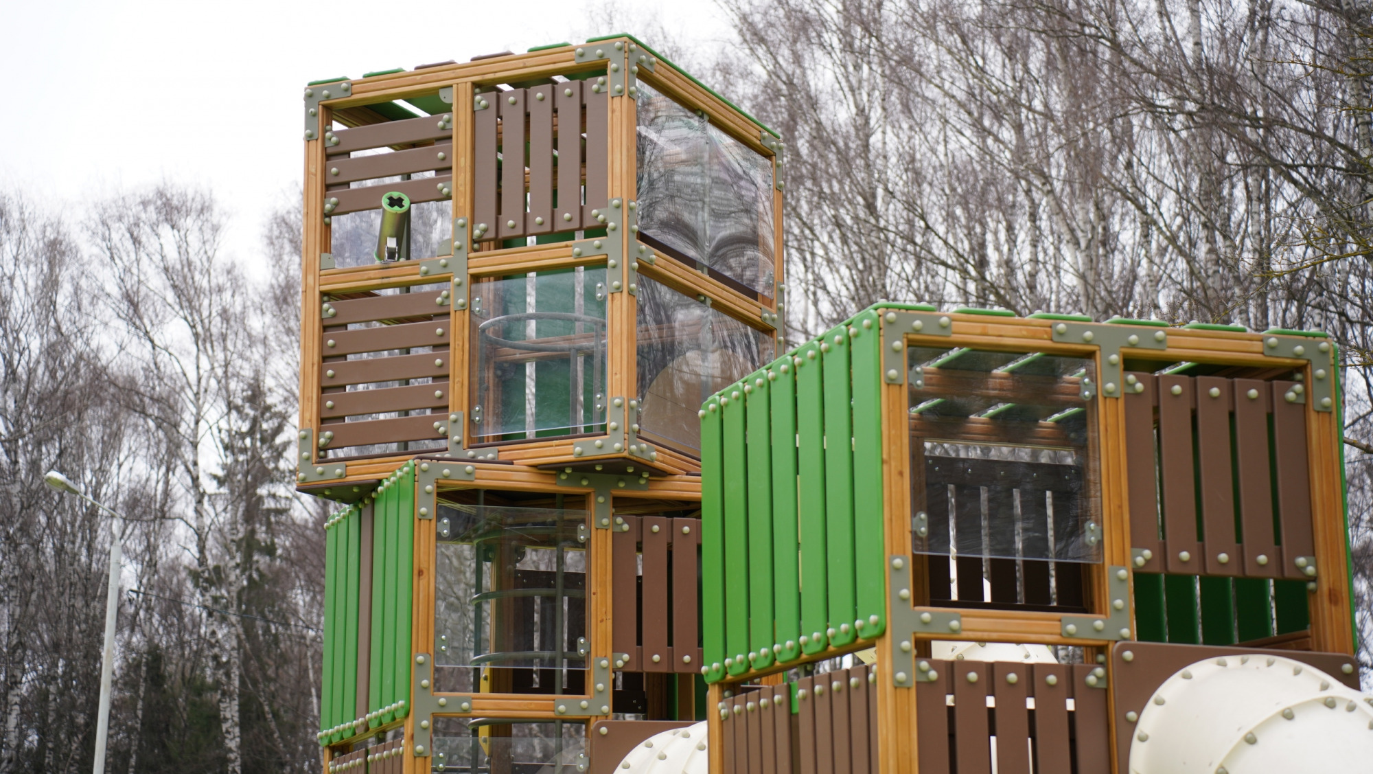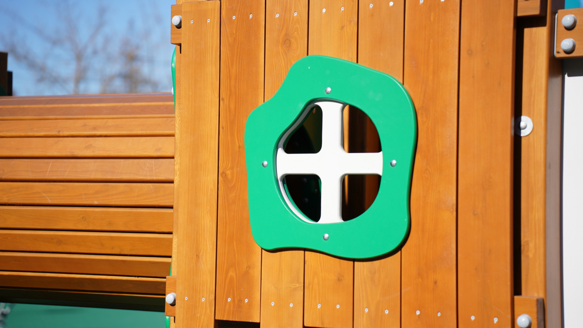 Зиму она пережила хорошо: после нескольких месяцев эксплуатации выглядит как новое, покрытие в норме. Ни сучка, ни задоринки — и в прямом, и в переносном смысле. Оцениваем эту детскую площадку на отлично.