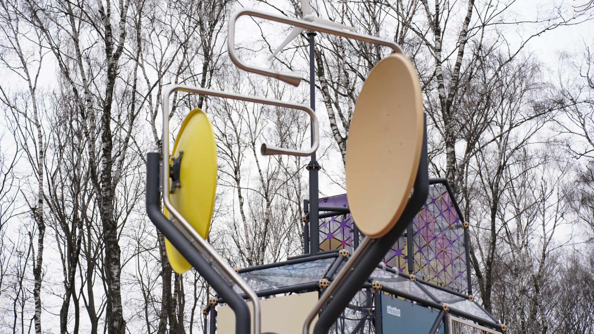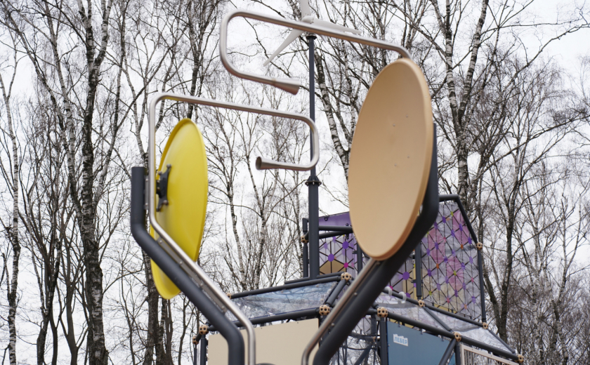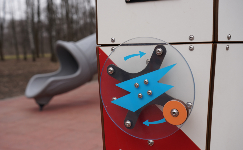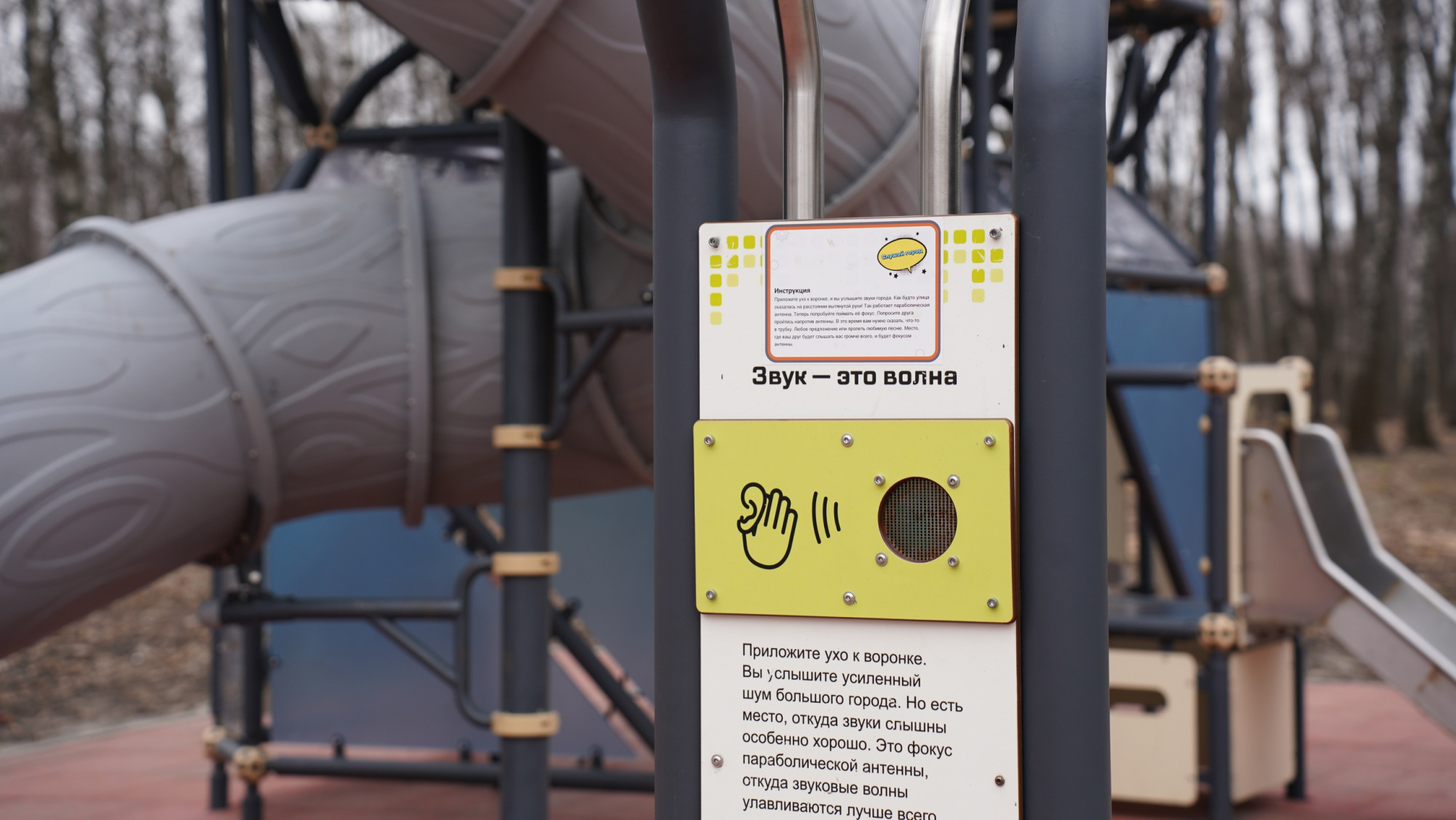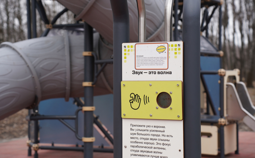 На входе в парк находится детская научная площадка: потратили на нее порядка 15 миллионов рублей и открыли в конце прошлого года. Здесь есть несколько игровых элементов, в разработке которых участвовали эксперты МГУ (так заявлялось) и травмобезопасное покрытие.