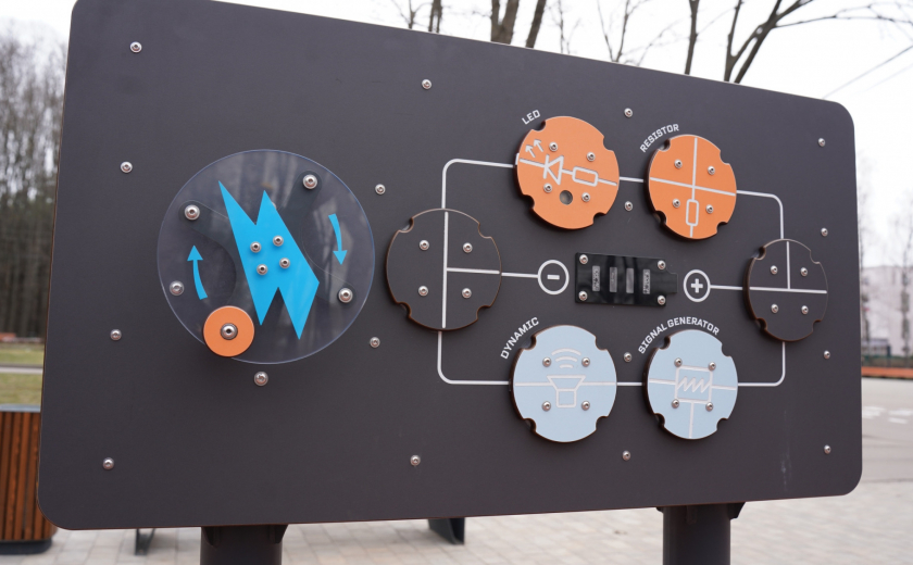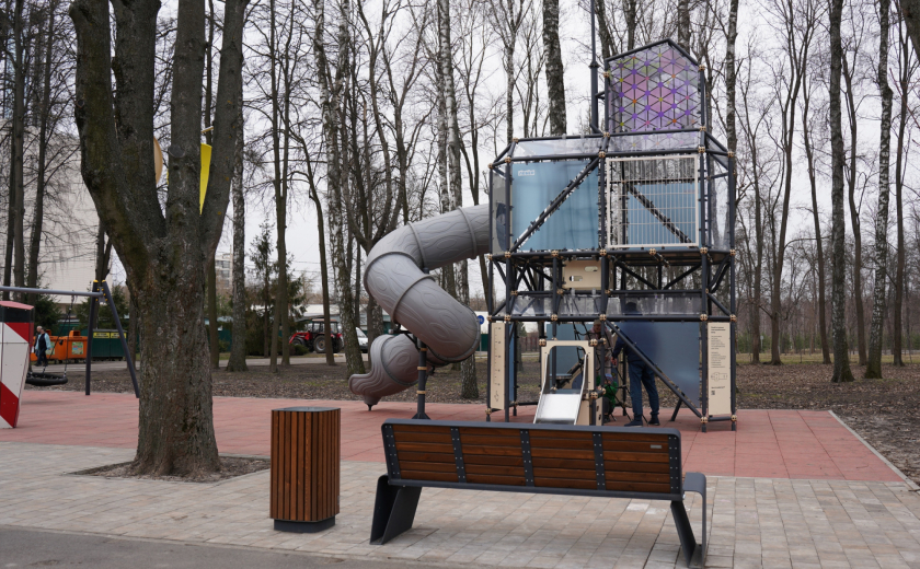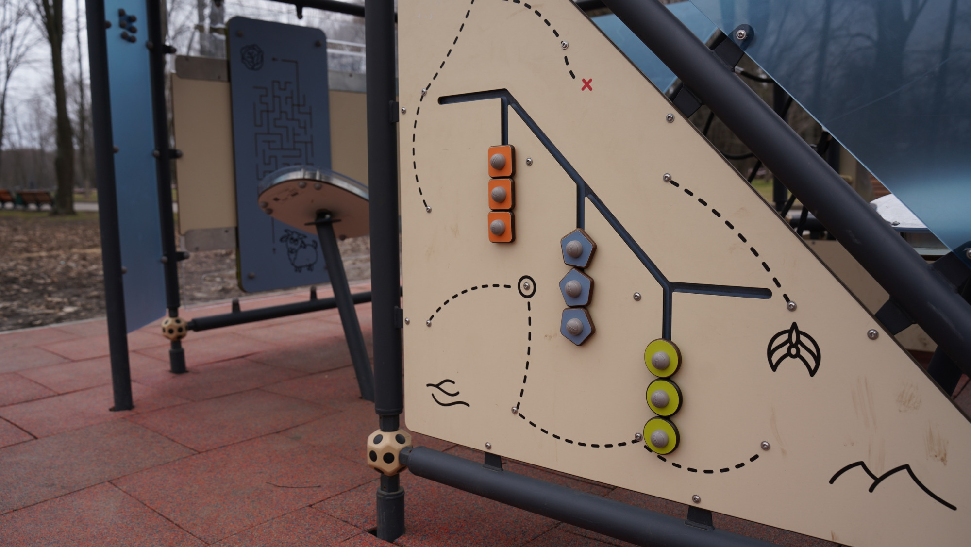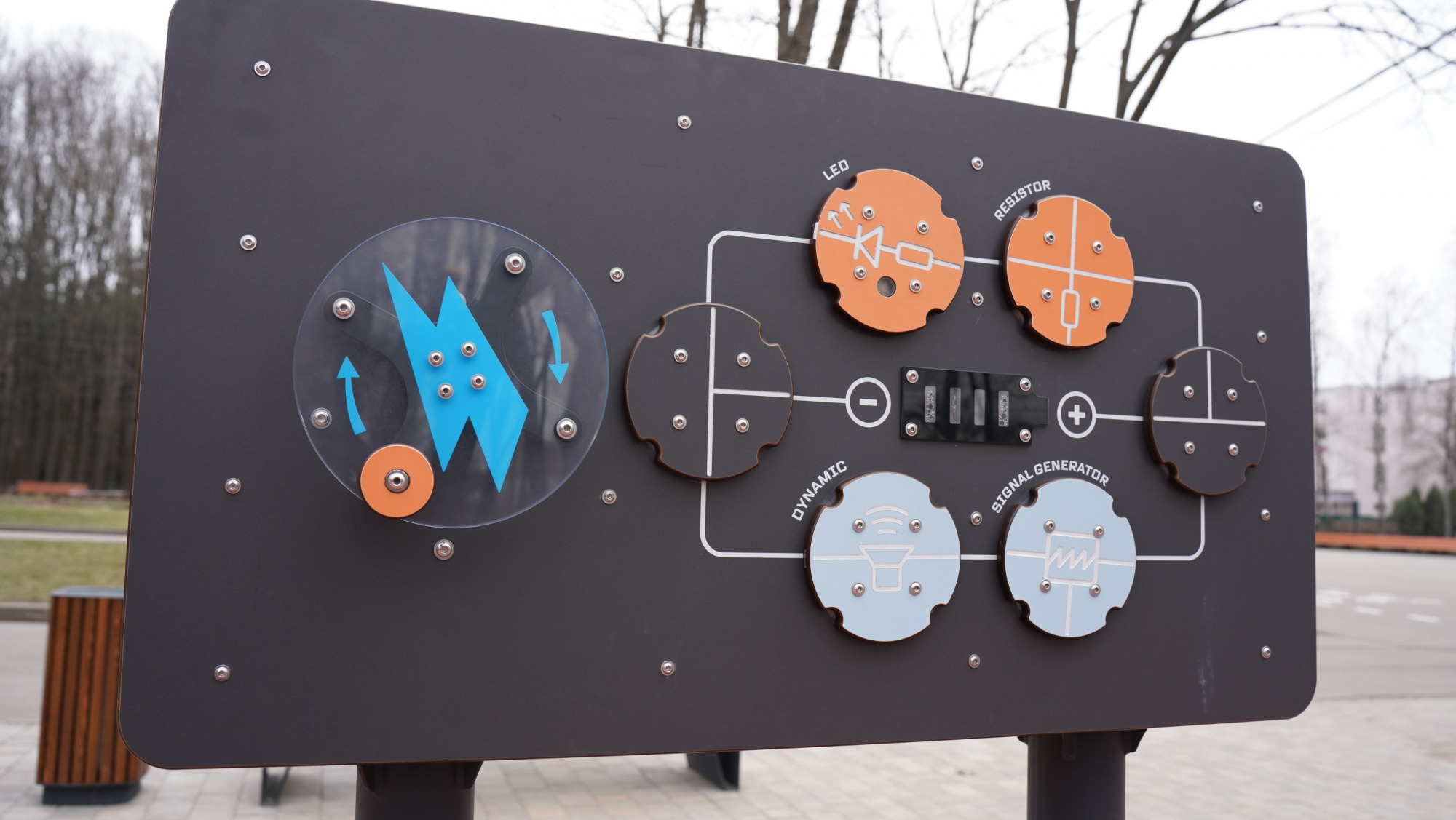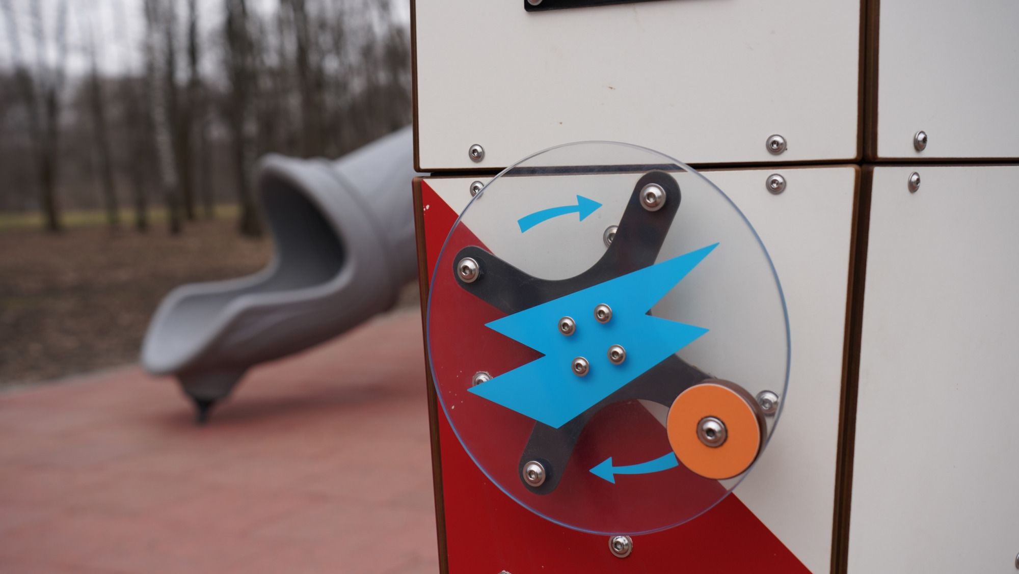 На входе в парк находится детская научная площадка: потратили на нее порядка 15 миллионов рублей и открыли в конце прошлого года. Здесь есть несколько игровых элементов, в разработке которых участвовали эксперты МГУ (так заявлялось) и травмобезопасное покрытие.