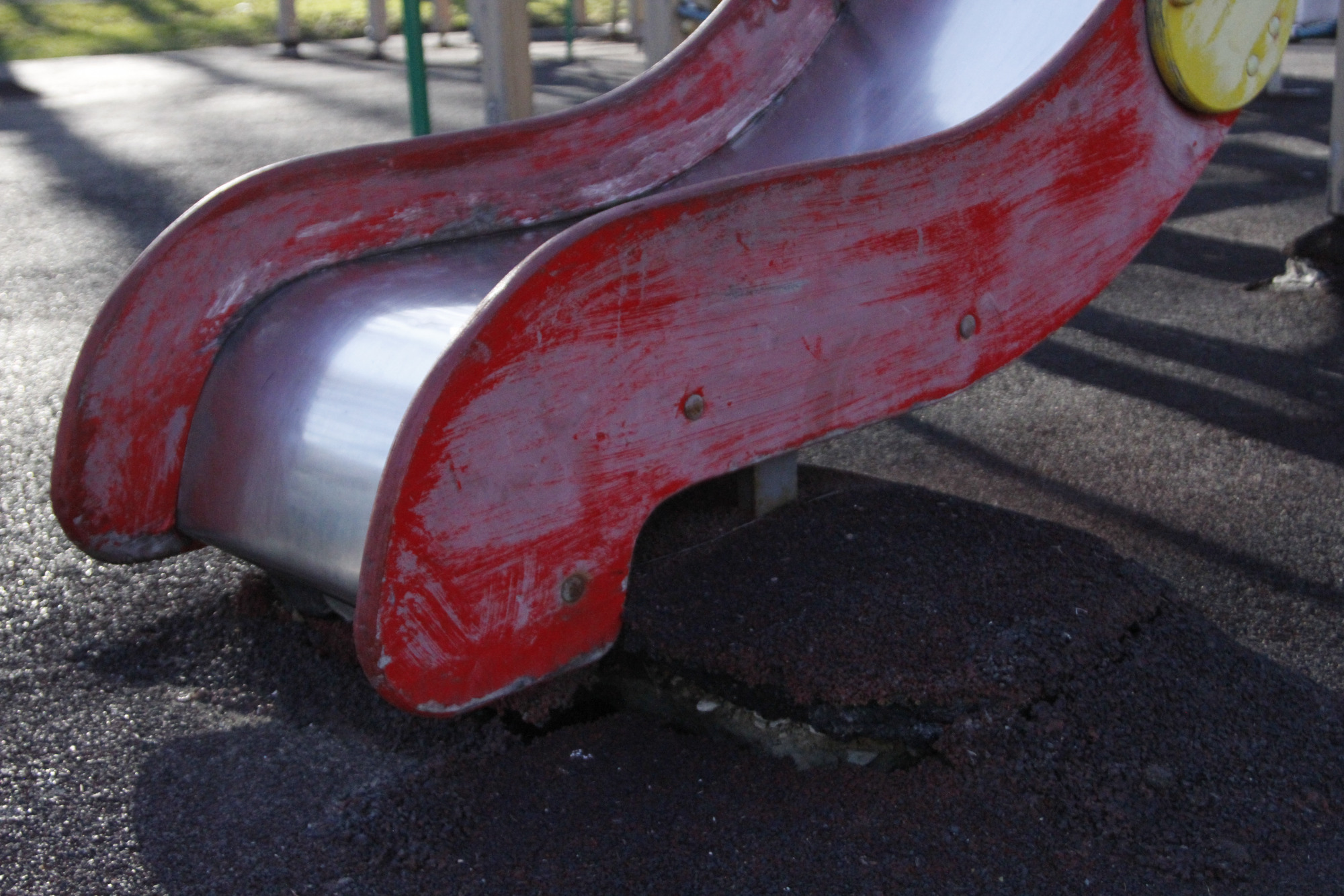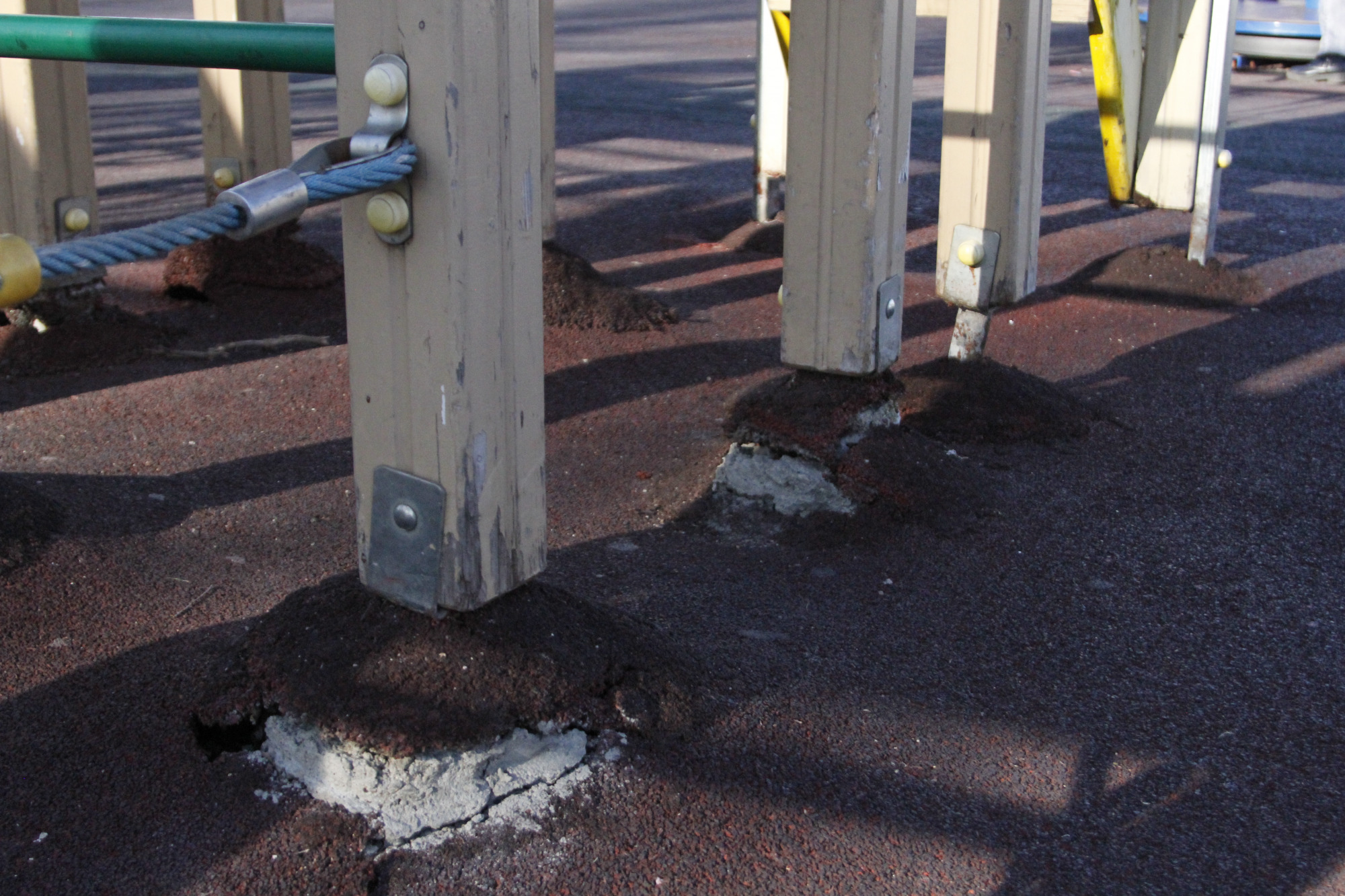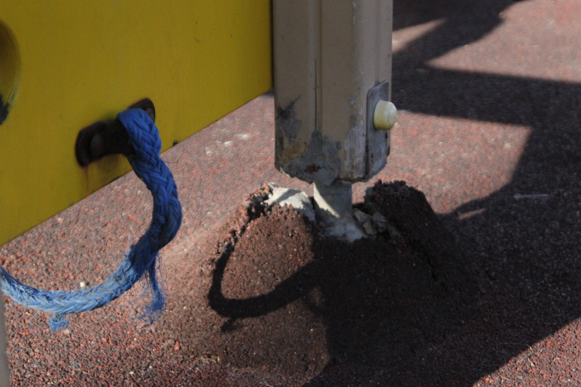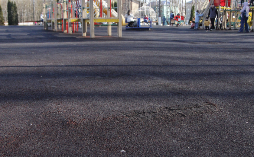 Покрытие только под замену. Местами оно пошло трещинами и «полиняло», есть заплатки и небольшие дыры, неровности. Самое неприятное: в местах установки игрового комплекса покрытие не просто вздулось, оно поднялось на несколько сантиметров вместе с цементом. Побежит ребенок, не заметит «препятствие», споткнется и упадет — царапины и ссадины в лучшем случае обеспечены.