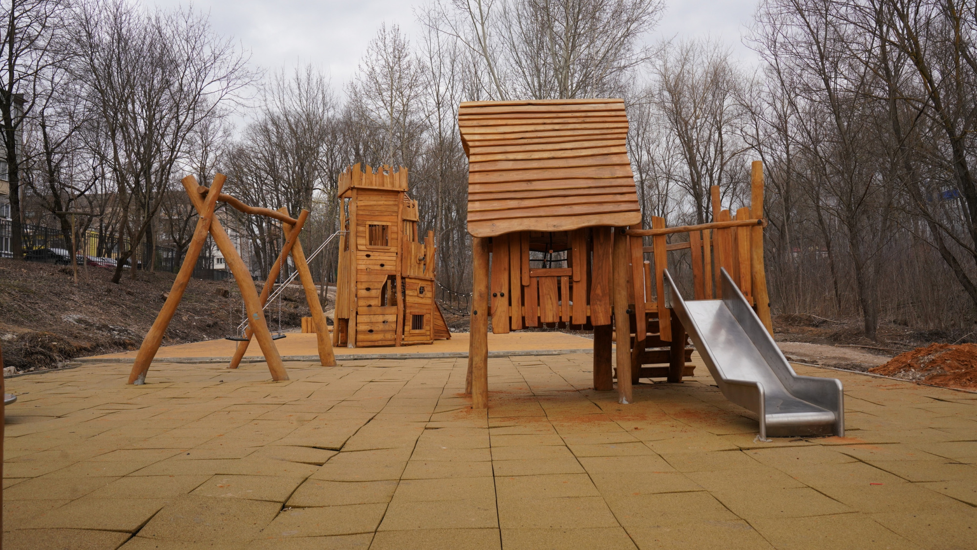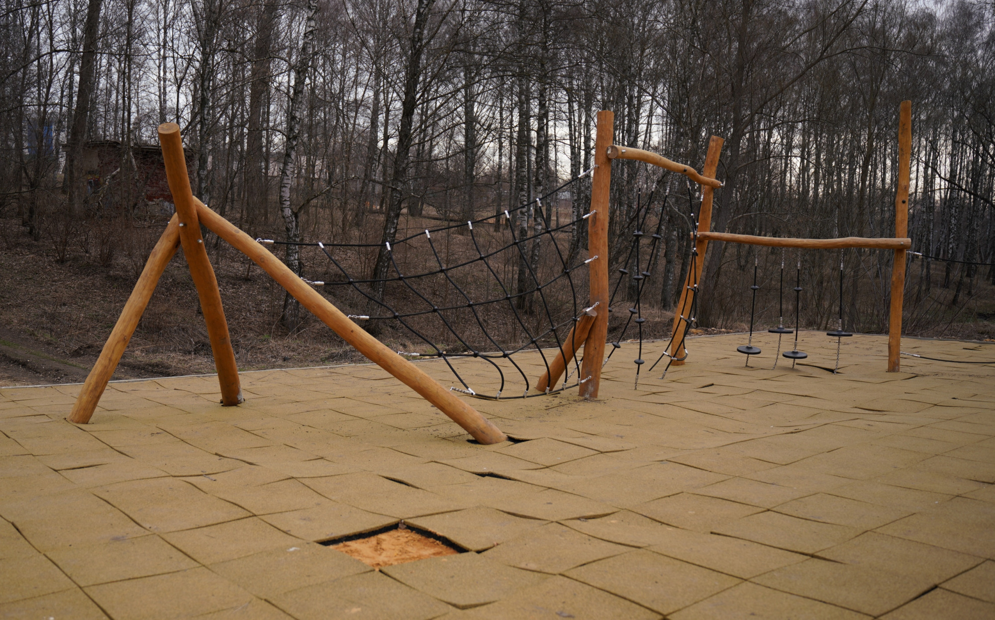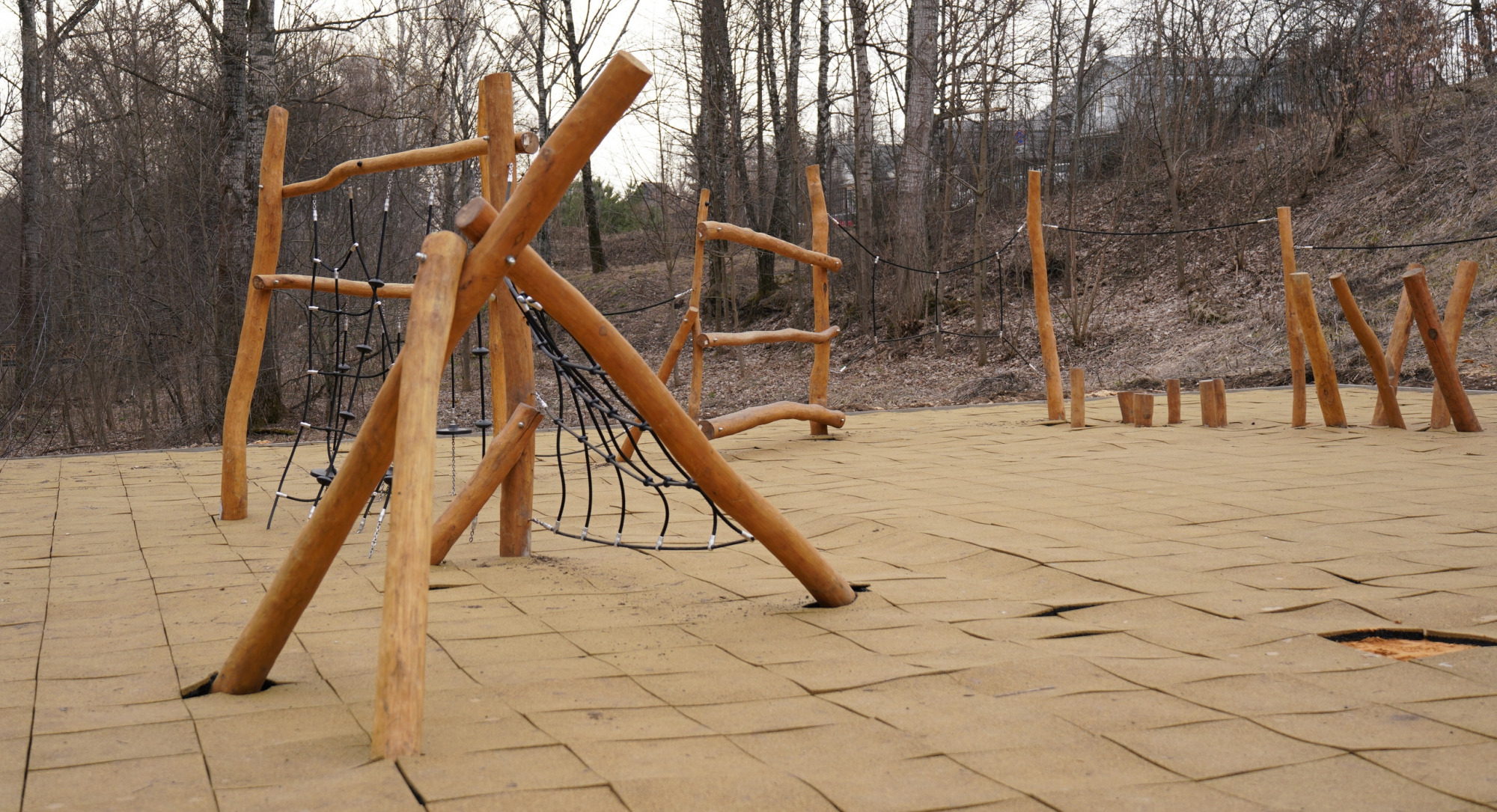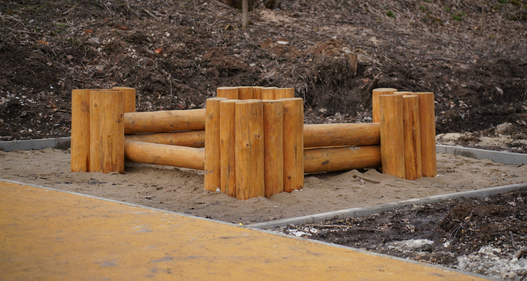 Покрытие здесь было уложено квадратами и, судя по всему, халтурно. Площадке от силы полгода, а она уже пошла «волной», в некоторых местах квадратов нет совсем. Не думаем, что это была задумка архитекторов. Игровое оборудование — деревянное и обработано плохо: есть шероховатости, а значит, будут занозы. Плюсом ко всему в этой части парка еще ведутся работы, поэтому на площадке много грязи и песка. Сюда бы сигнальную ленту.