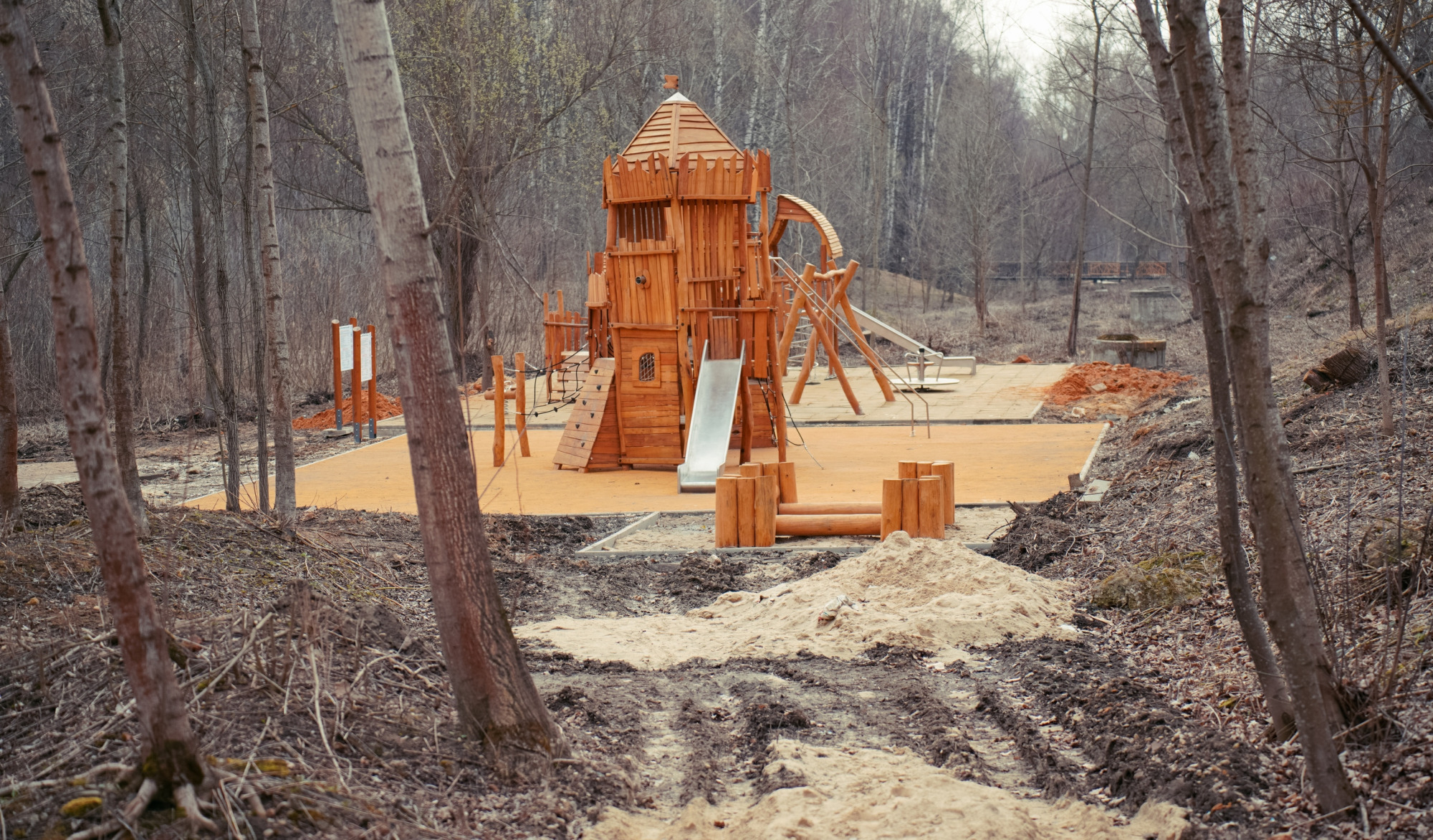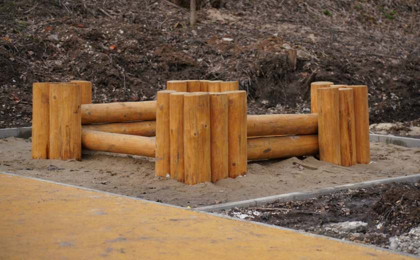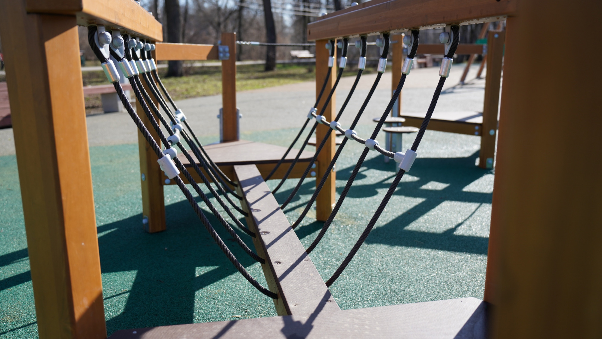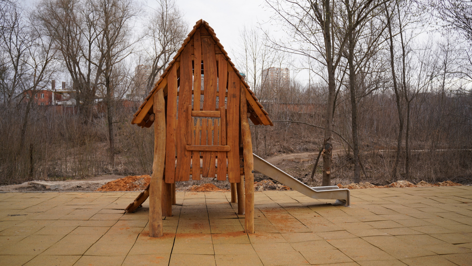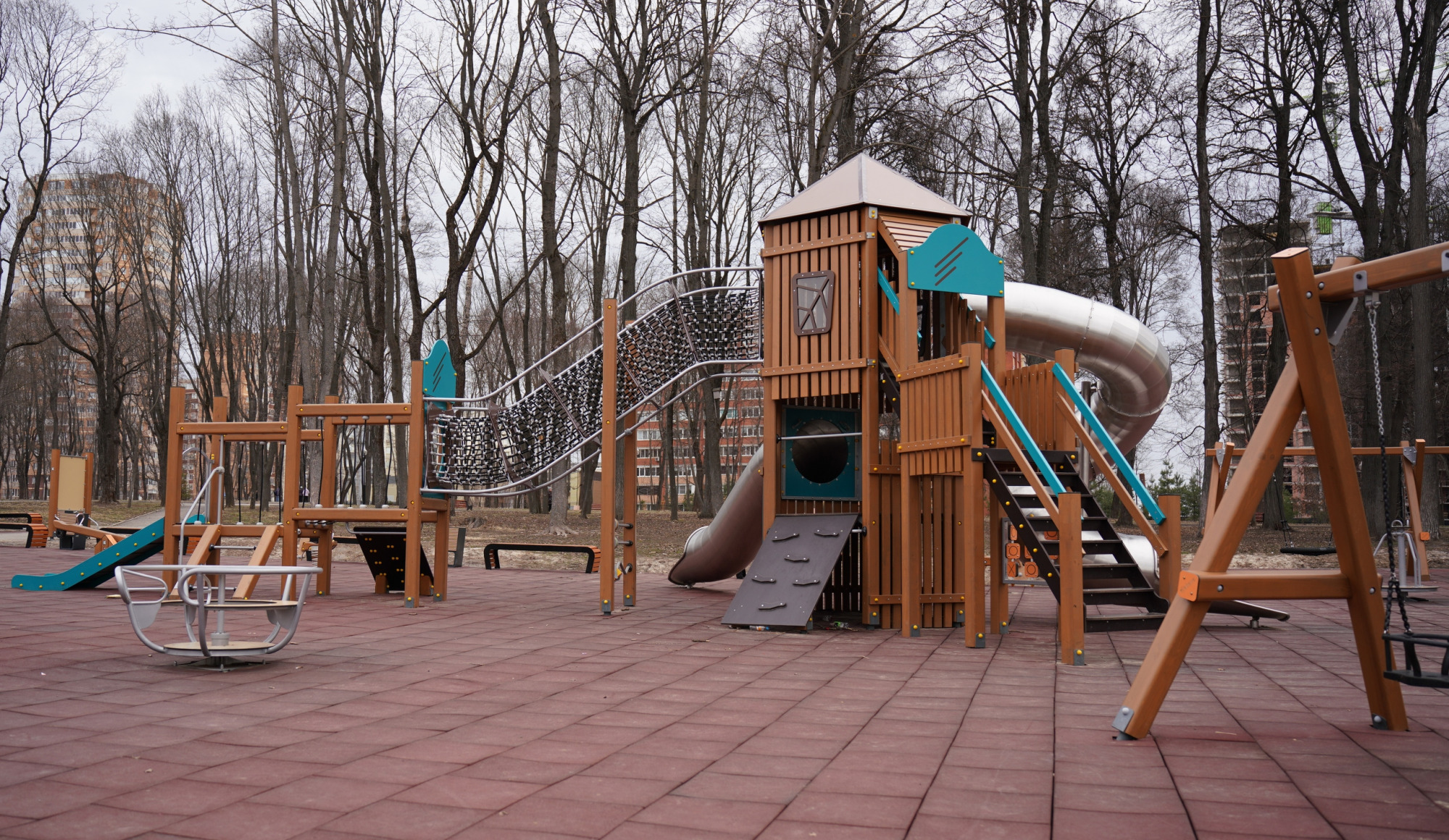 Покрытие здесь было уложено квадратами и, судя по всему, халтурно. Площадке от силы полгода, а она уже пошла «волной», в некоторых местах квадратов нет совсем. Не думаем, что это была задумка архитекторов. Игровое оборудование — деревянное и обработано плохо: есть шероховатости, а значит, будут занозы. Плюсом ко всему в этой части парка еще ведутся работы, поэтому на площадке много грязи и песка. Сюда бы сигнальную ленту.