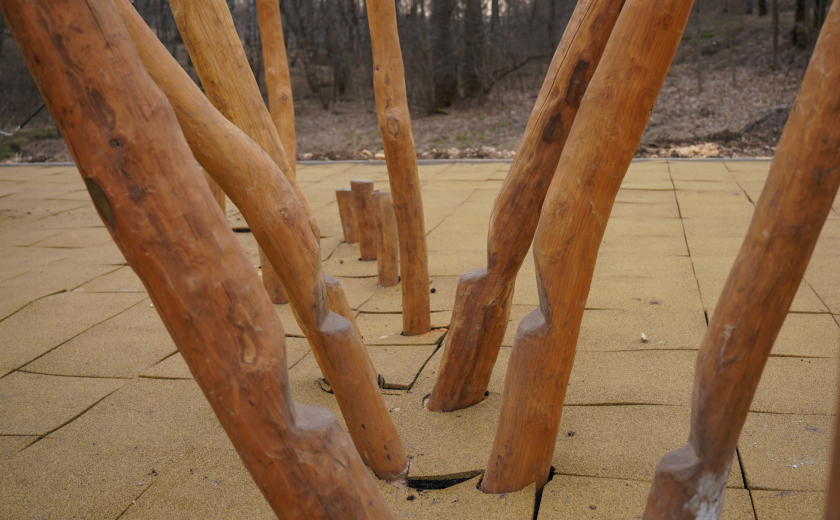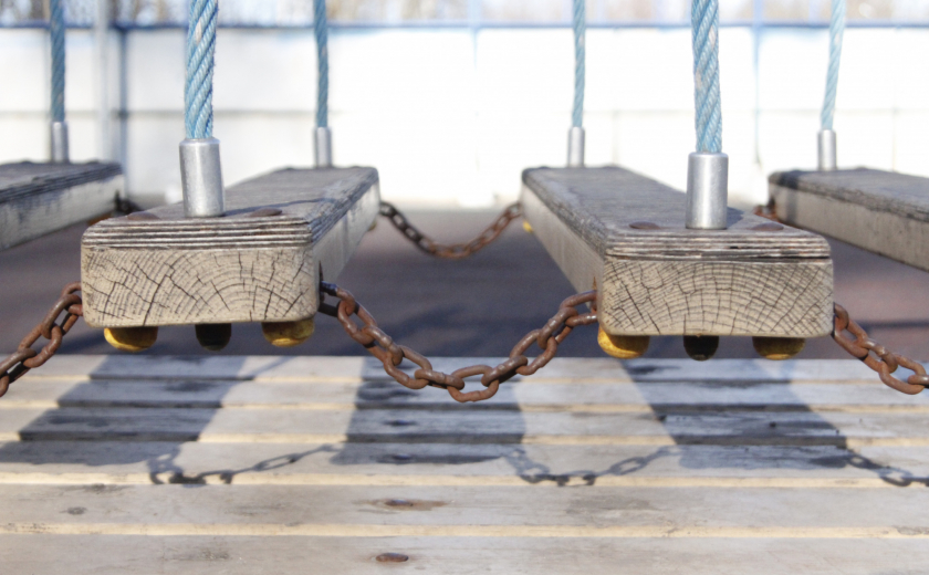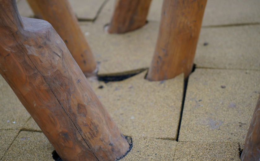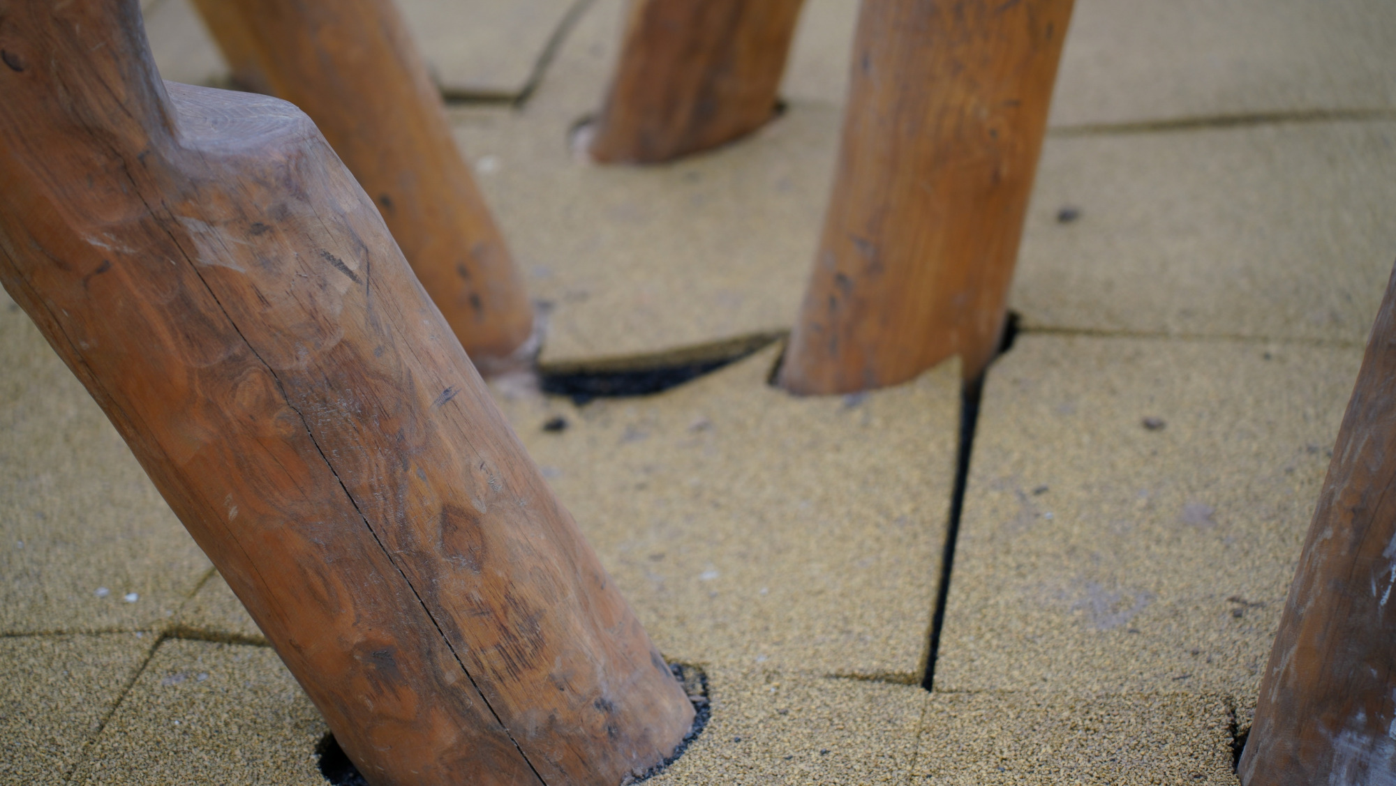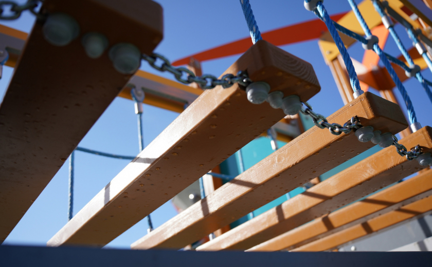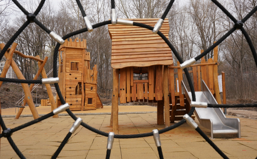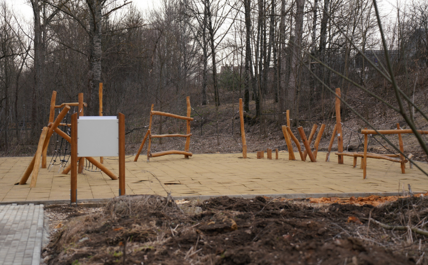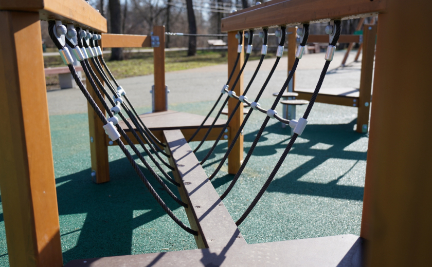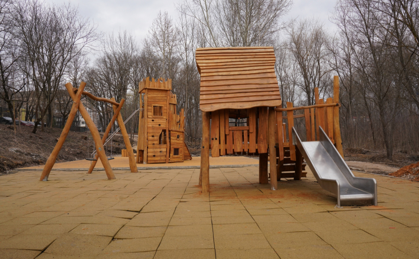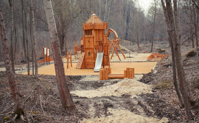 Покрытие здесь было уложено квадратами и, судя по всему, халтурно. Площадке от силы полгода, а она уже пошла «волной», в некоторых местах квадратов нет совсем. Не думаем, что это была задумка архитекторов. Игровое оборудование — деревянное и обработано плохо: есть шероховатости, а значит, будут занозы. Плюсом ко всему в этой части парка еще ведутся работы, поэтому на площадке много грязи и песка. Сюда бы сигнальную ленту.