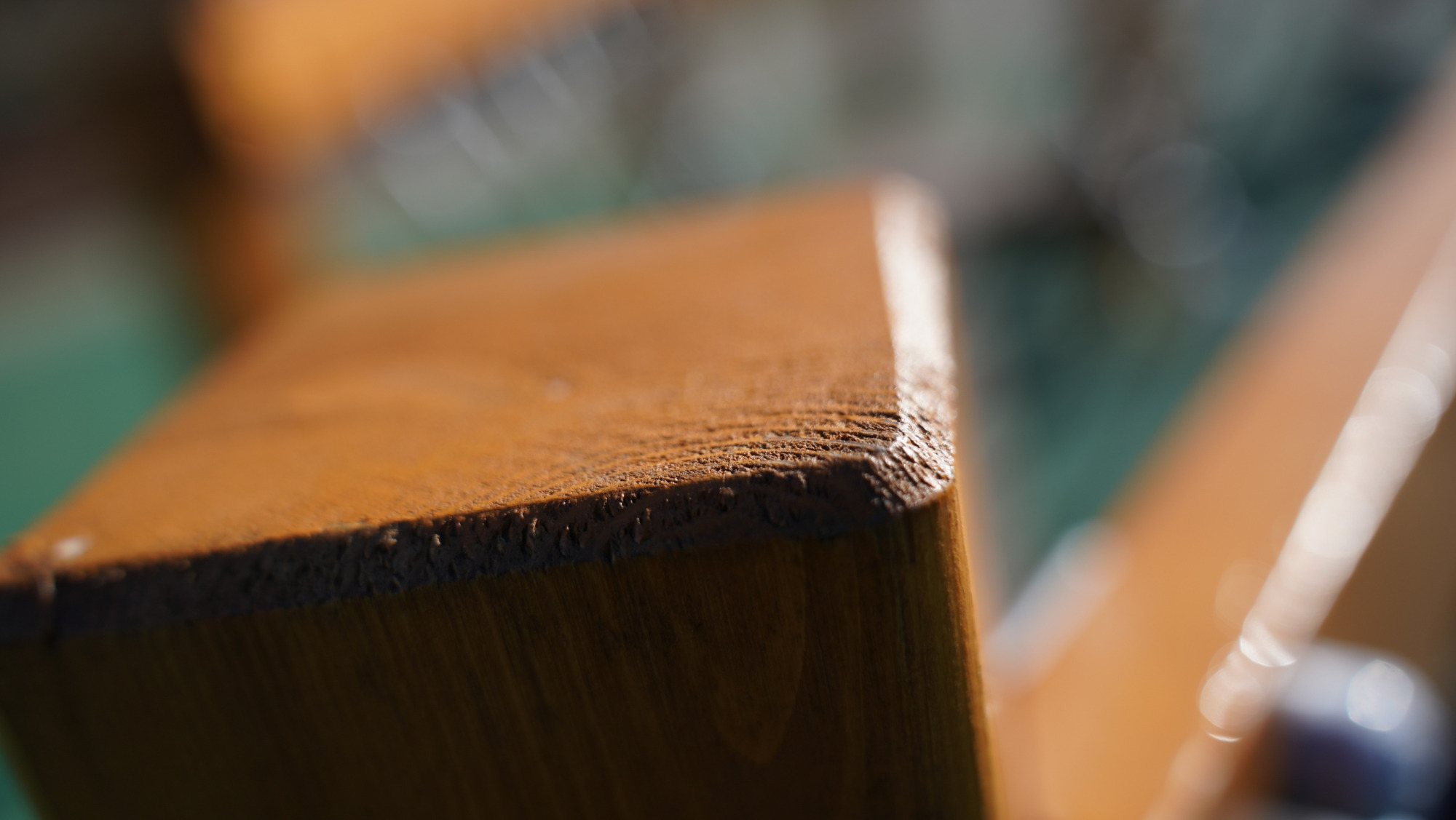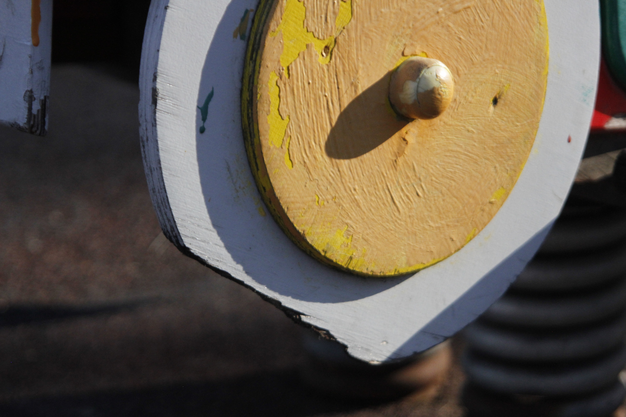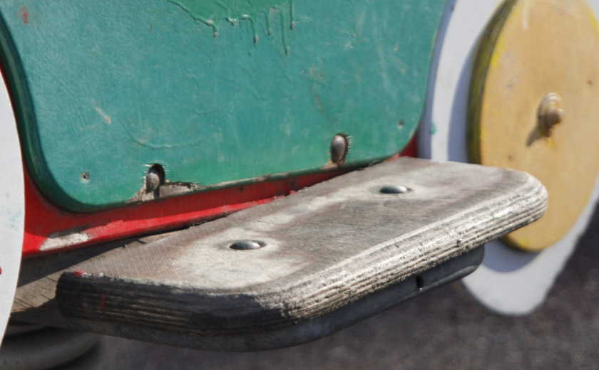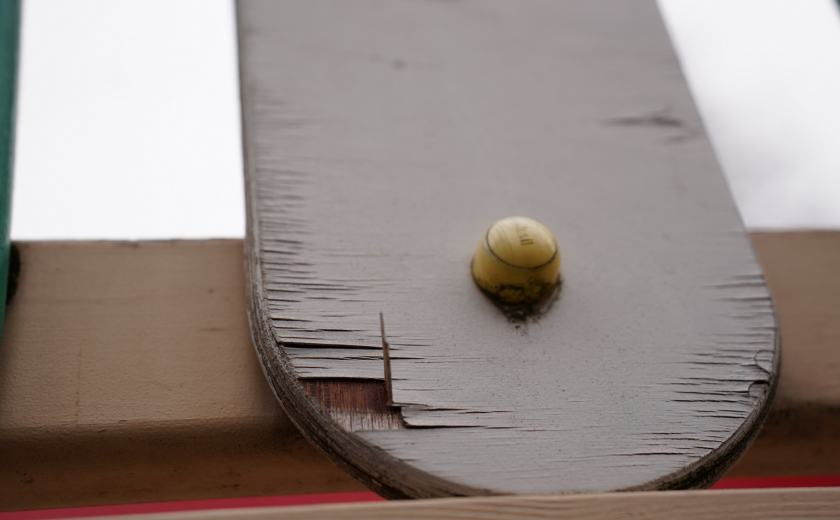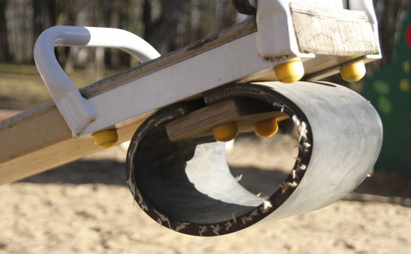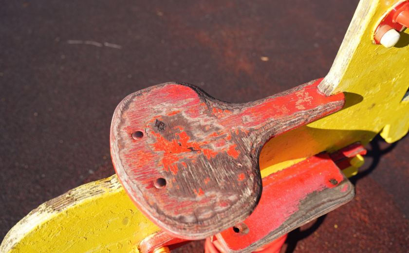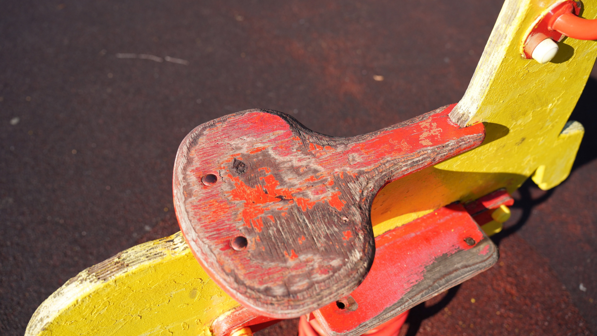 Вопросы есть и к игровому оборудованию. Металлические элементы уже покрылись ржавчиной, пластиковые — выцвели и выглядят ненадежными. Деревянные детали облезли и потрескались, где-то отломаны. Так что заноз тут не избежать. Похоже, этой детской площадке простой косметический ремонт не поможет — только реконструкция.