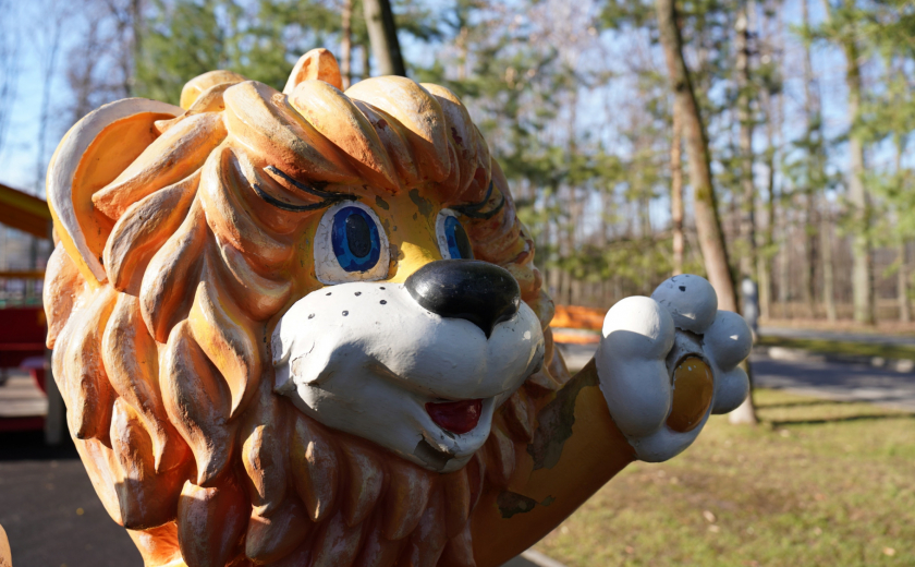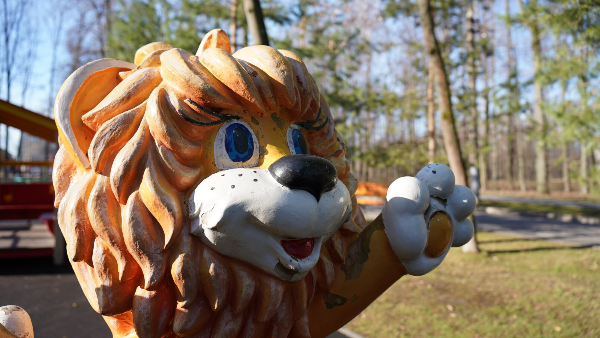 Детский городок находится в центральной части Комсомольского парка и, как в Центральном парке, является подарком Владимира Груздева. Карусель, качели, горки, лабиринт с цепочками, лесенки, веранда на случай дождя повидали на своем веку многое — и это заметно. Краска (которую не раз обновляли) выцвела и облупилась, местами — потрескалась, покрытие с заплатками «немного заволновалось». Фигурка Львенка, приветливо машущая лапой, выглядит уставшей.