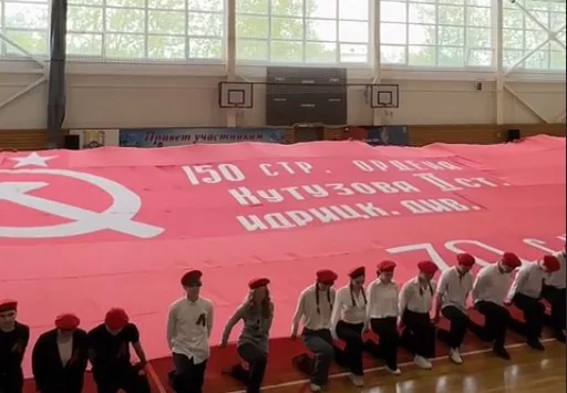 Юнармейцы, активисты «Движения Первых», волонтеры, кадеты, участники СВО развернули гигантскую копию главного символа Победы размером в 200 квадратных метров.