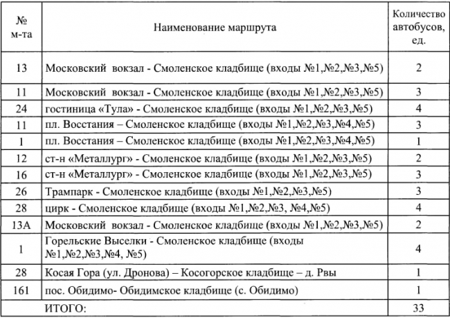 С 06:30 до 15:00 20 апреля до Смоленского кладбища и других мест захоронений в Туле будет организовано движение автобусов в режиме «экспресс» и «полуэкспресс». Перевозки будут осуществлять более тридцати единиц транспорта, исходя из следующего расчета: