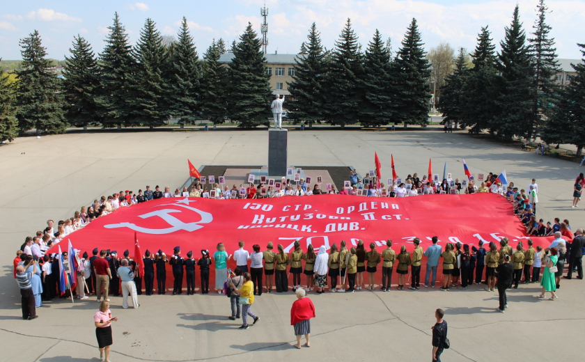 В Плавске прошел митинг «Равнение на Знамя Победы». Местные жители — представители трудовых коллективов, общественных молодежных и ветеранских организаций, Волонтеры Победы — собрались на городской площади и растянули копию Знамени площадью 200 кв.м.