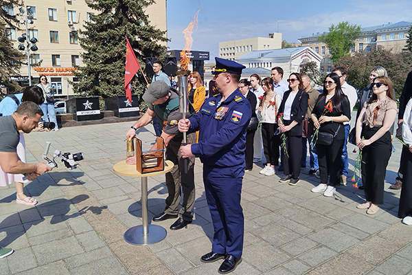 На площади Победы состоялся торжественный забор священного огня, такие акции прошли еще в семи городах-героях. После участники возложили венки и цветы к мемориалу «Три штыка» и почтили память павших в Великой Отечественной войне минутой молчания.