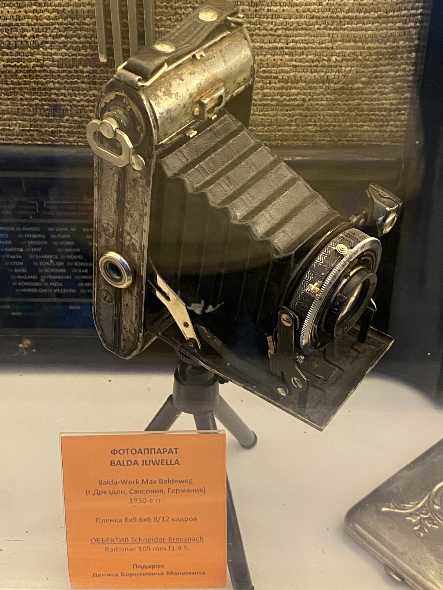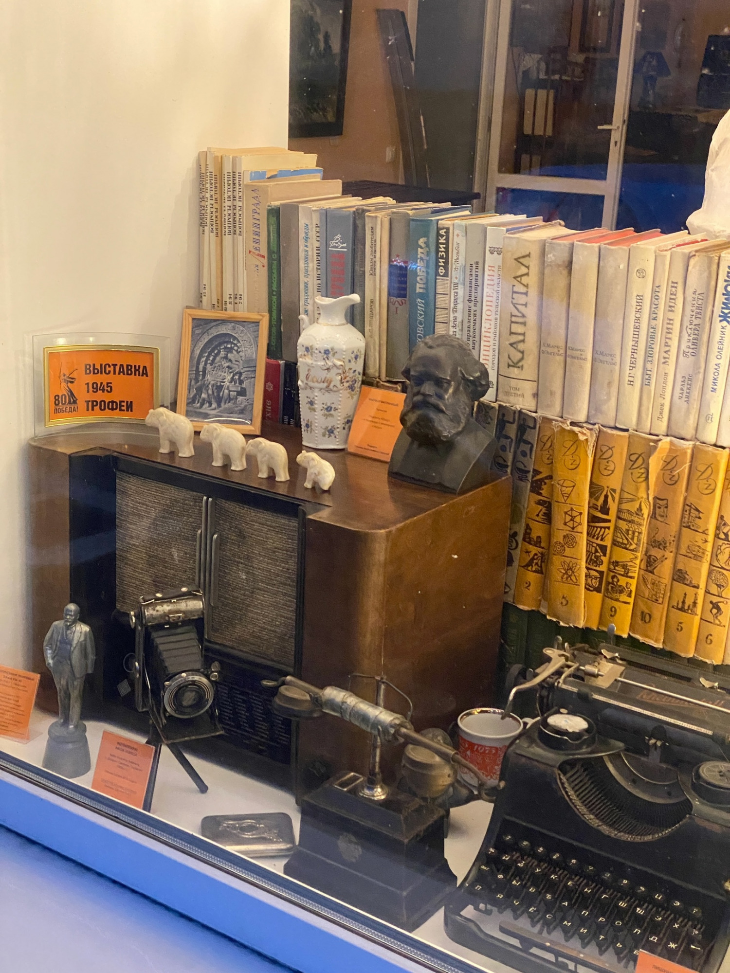 Выставка представляет собой композицию из четырех трофейных предметов: радиоприемника, кувшина, пишущей машини и фотоаппарата. Ее можно увидеть прямо с улицы — через большое окно ТИЦ.