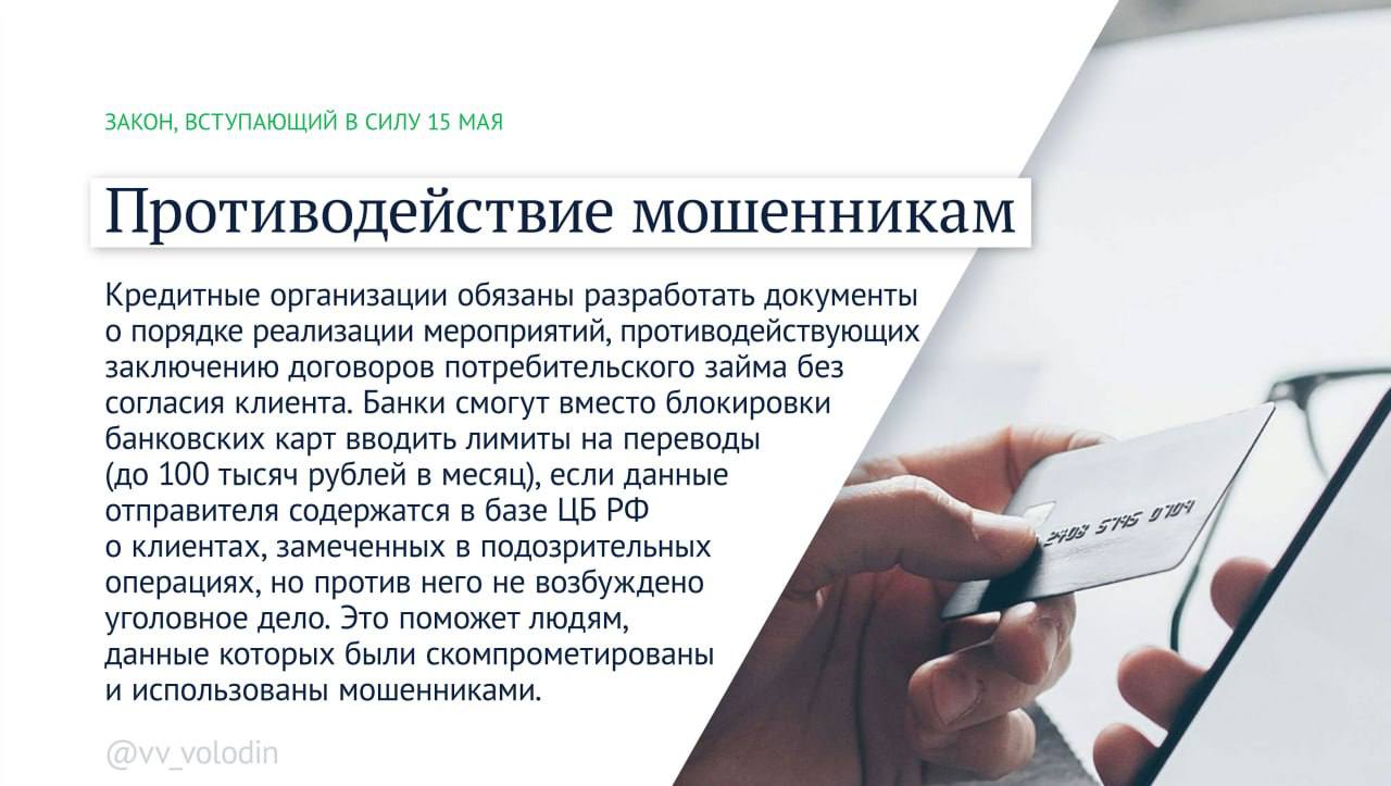 Закон вступает в силу 15 мая. Теперь банки обяжут разработать документы о реализации мероприятий по противодействию оформления кредитов без согласия клиентов.