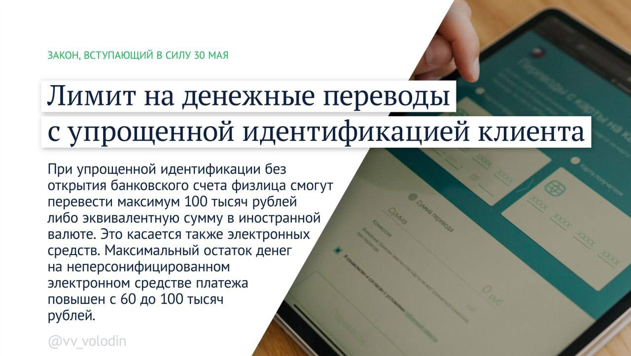 Закон вступит в силу 30 мая. При упрощенной идентификации без открытия банковского счета люди смогут переводить до 100 тысяч рублей или ту же сумму в валюте.