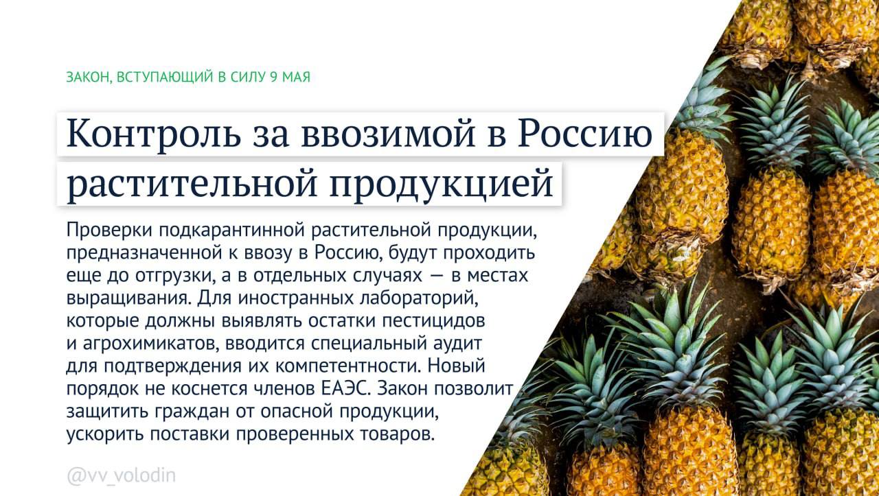 Закон вступит в силу 9 мая. Теперь проверять подкарантинную растительную продукцию для ввоза в Россию будут до отгрузки или в местах выращивания (в отдельных случаях).
