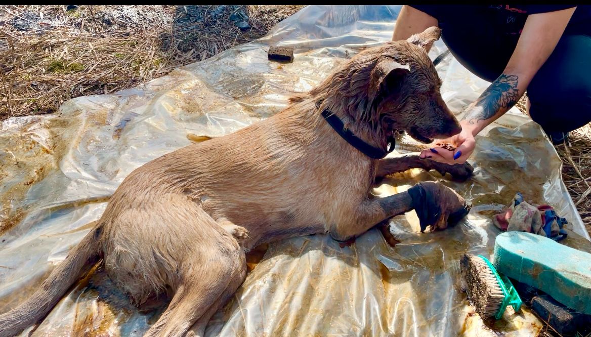 Появились жуткие кадры с места, где собаки провалились в битум под Тулой. Напомним, в Болохове двое животных провалились в яму. Их удалось достать, но одна собака, к сожалению, не выжила. Спасали питомцев из плена местные жители.