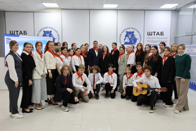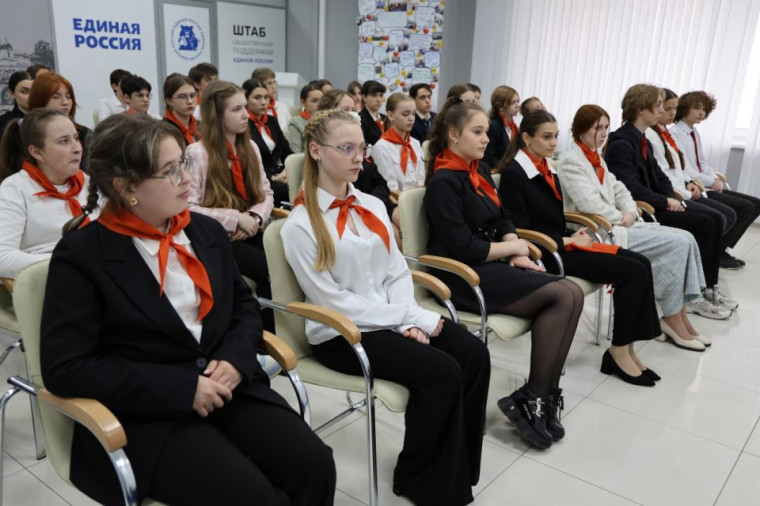 Встреча проходила в День пионерии. Ребята подарили Алексею Эрку и Дарье Герасимовой пионерские галстуки.