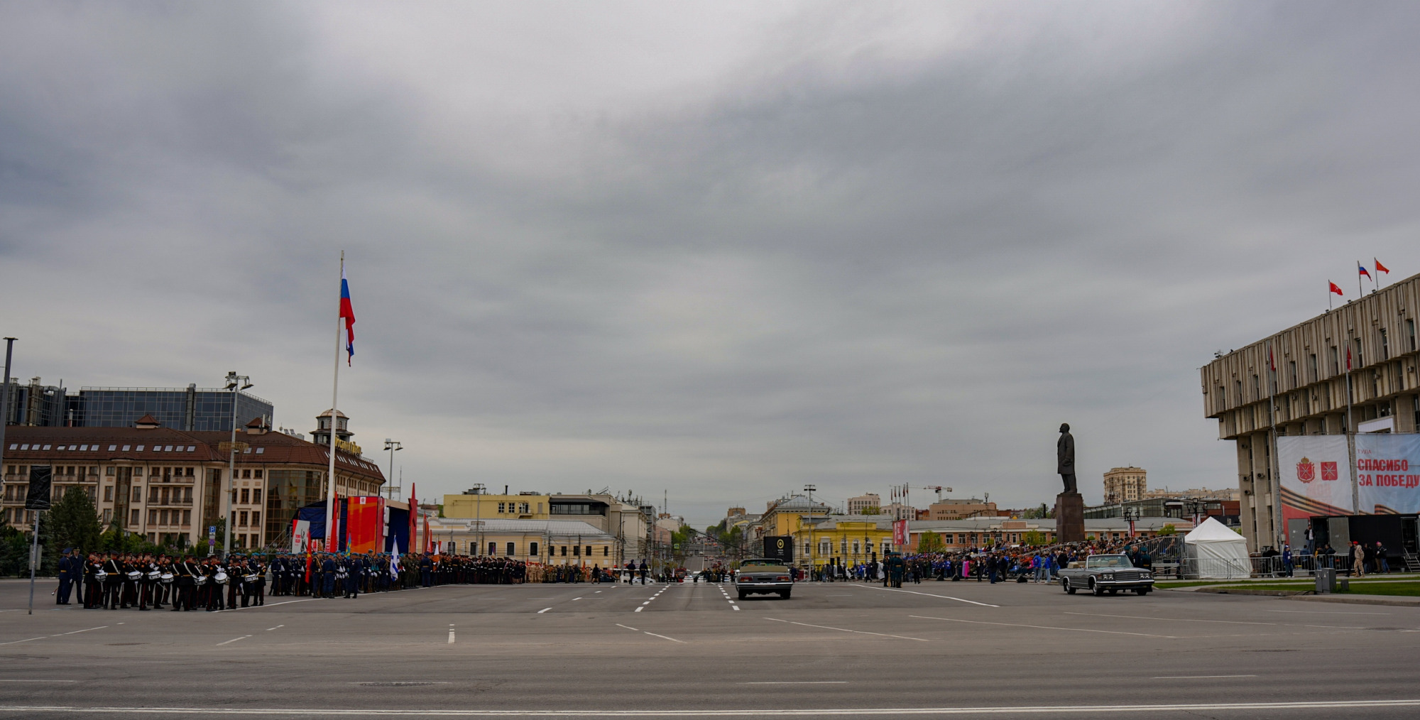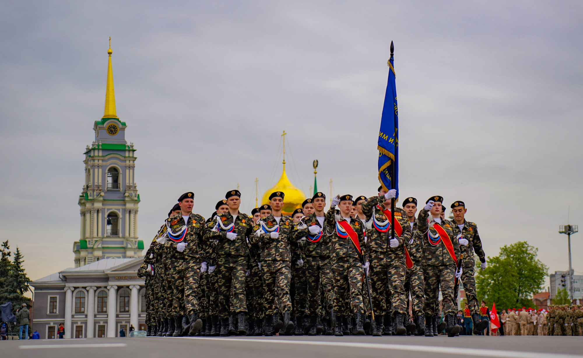 На площади Ленина в Туле 7 мая прошла генеральная репетиция парада Победы. Как мы уже писали ранее, сегодня на трибунах присутствовали зрители — школьники и молодежь из районов, ребята из приграничных территорий, которые сейчас находятся в Тульской области в гостях, волонтеры и представители народных полков, оказывающих помощь участникам специальной военной операции.