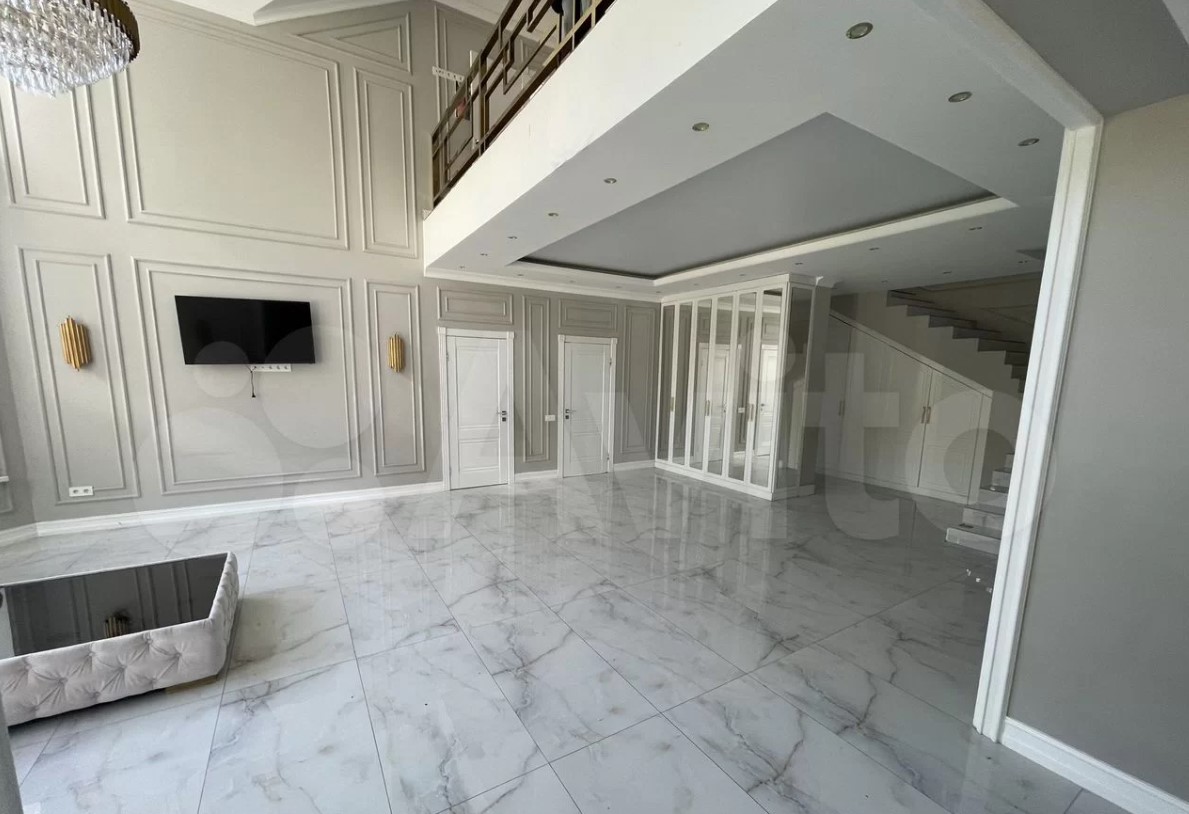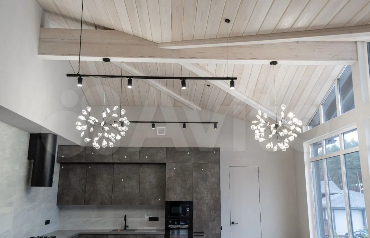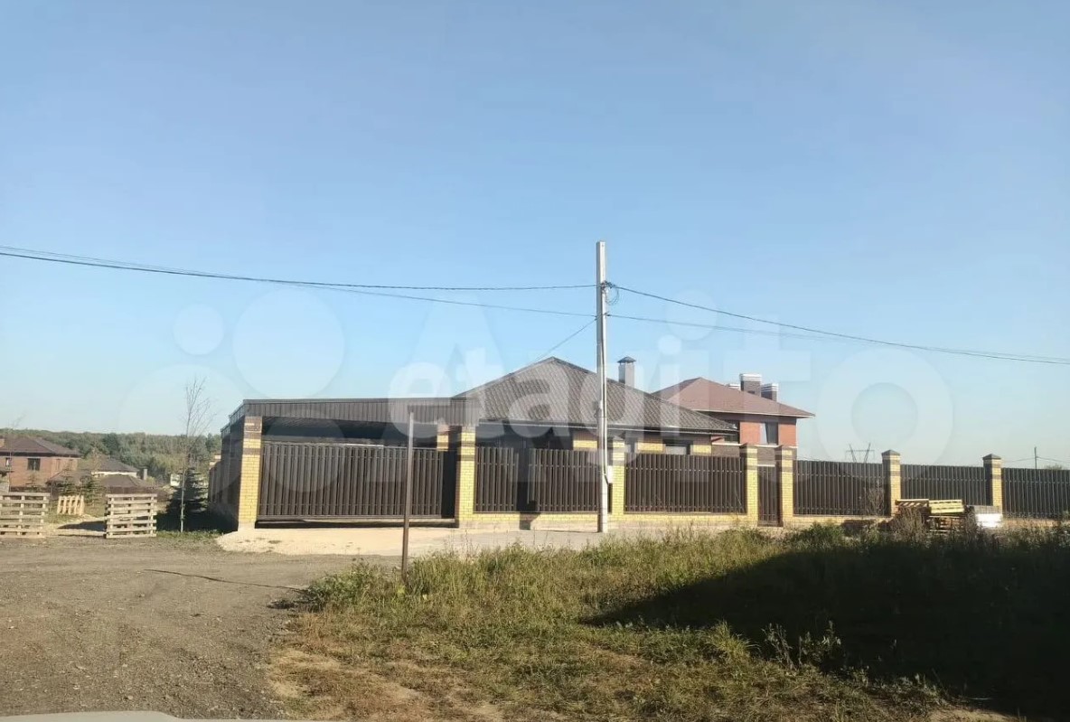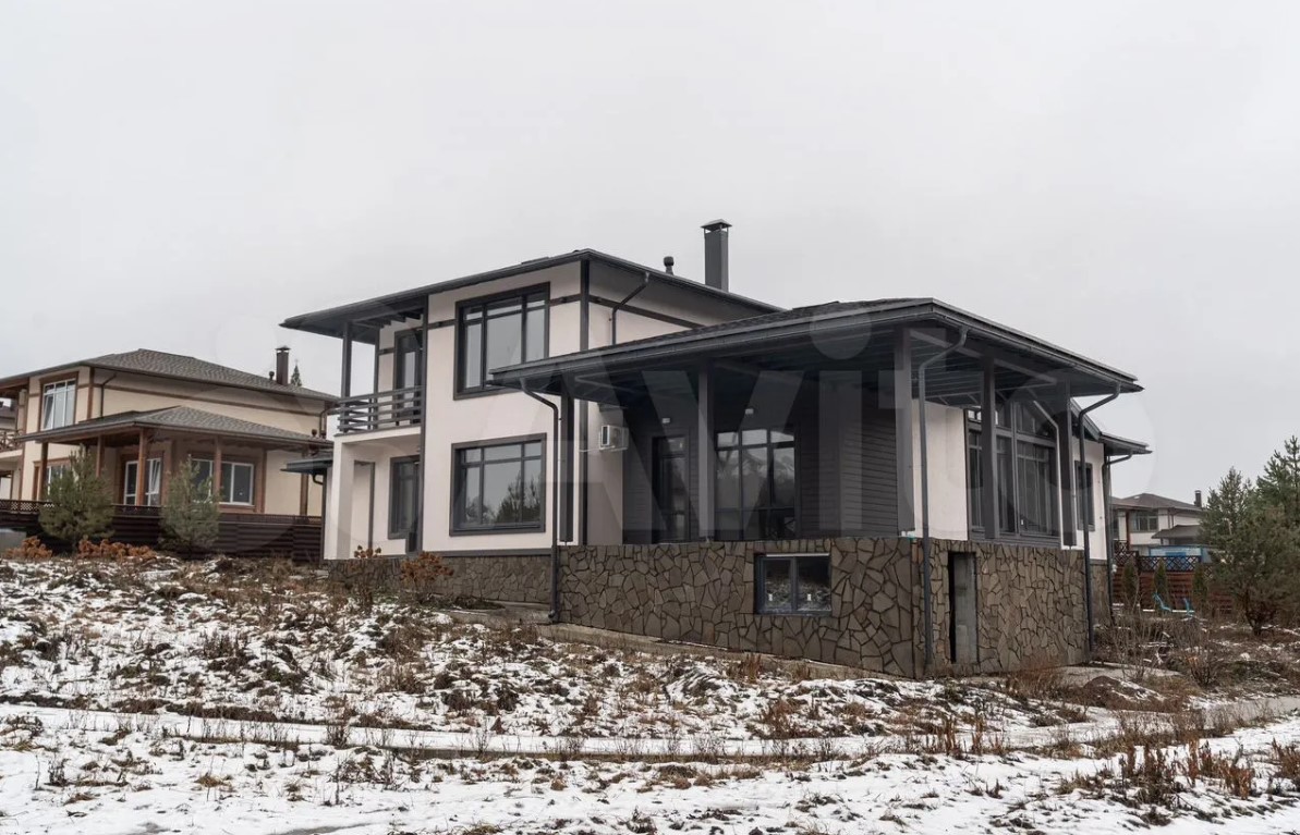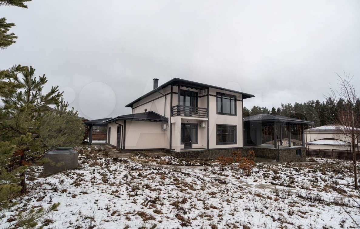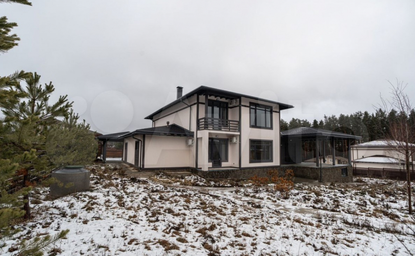 Внутри — гостиная с панорамными окнами, кухня-столовая, пять спален, две из которых с ванными комнатами и гардеробными, три санузла, кабинет и холл. На участке есть гараж с хозблоком.