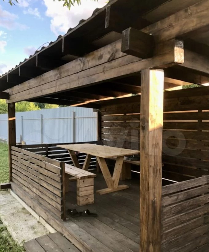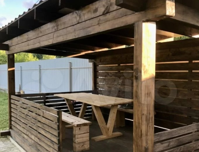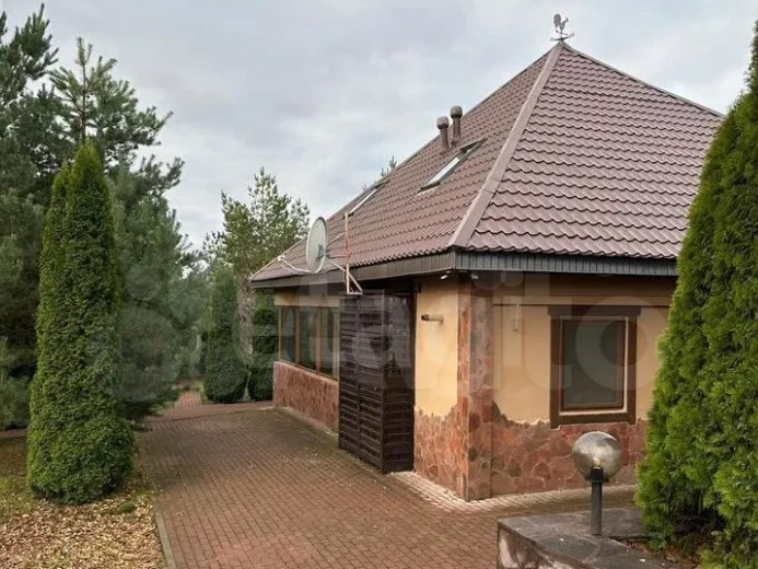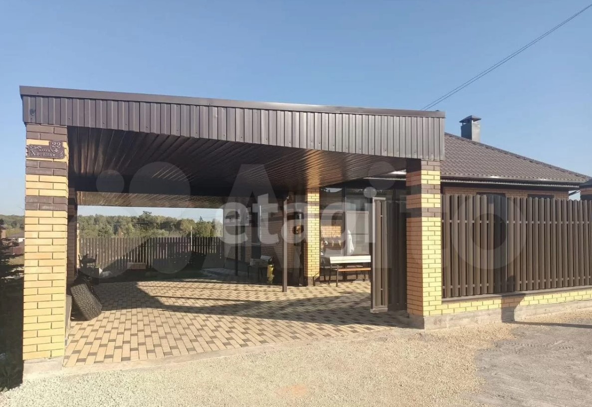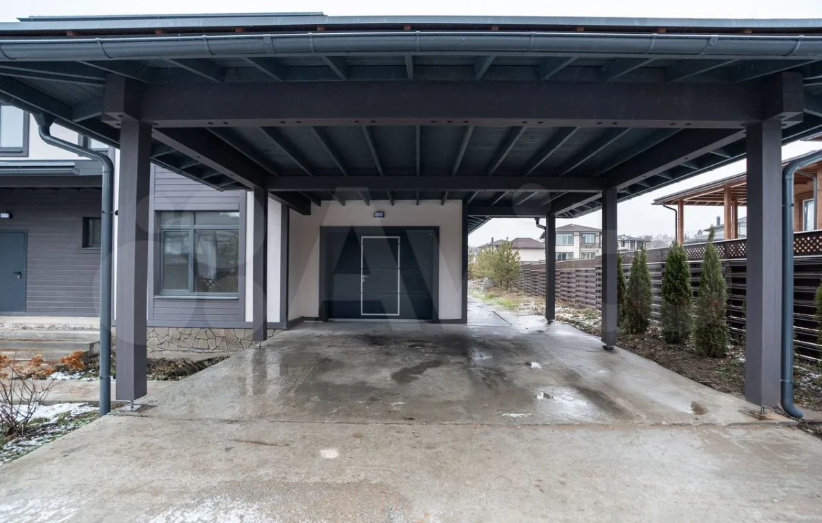 Дом находится на берегу водоема с оборудованным пляжем. На территории есть навес для двух машин. На участке также можно построить гараж или беседку.