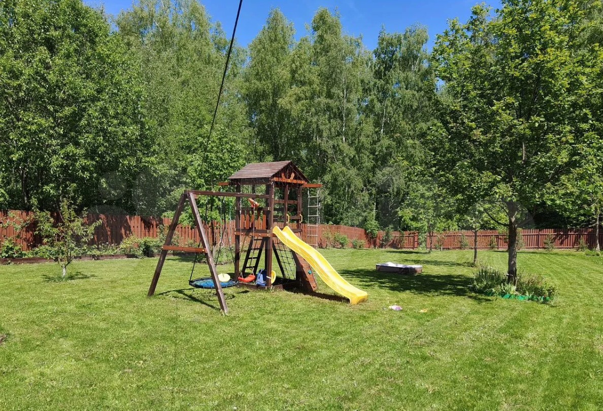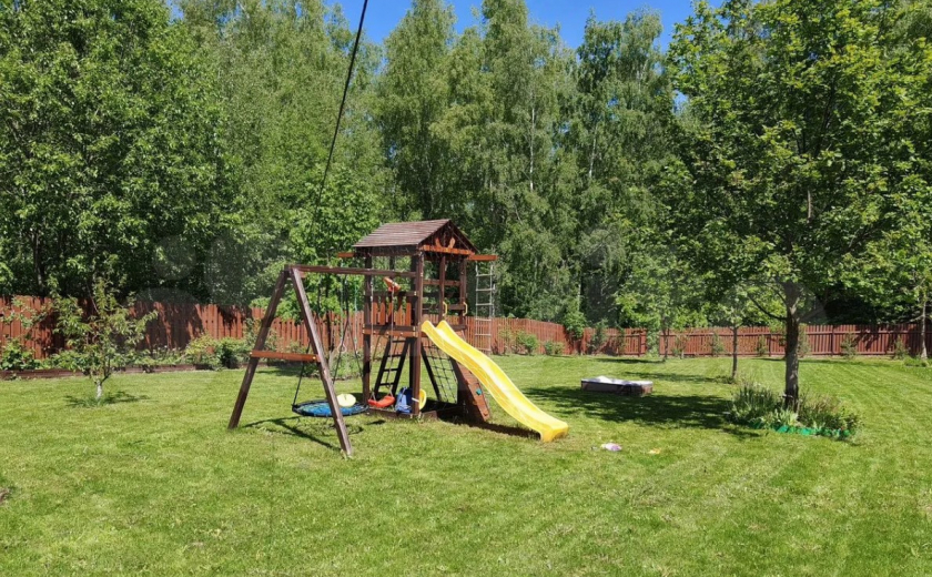 На участке также есть детская площадка, отдельно стоящая баня с бильярдной и гараж с навесом на две машины, а также зона барбекю. Высажены плодовые деревья и кустарники.