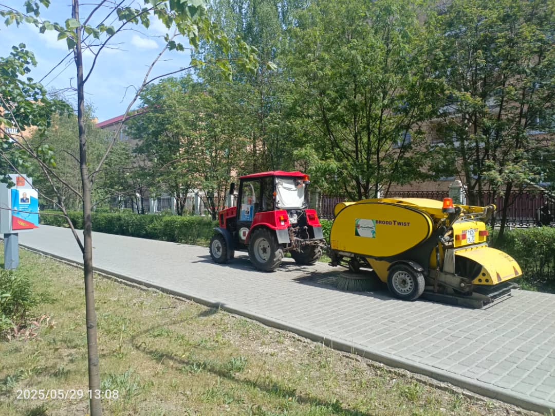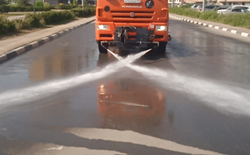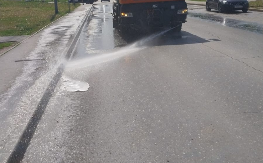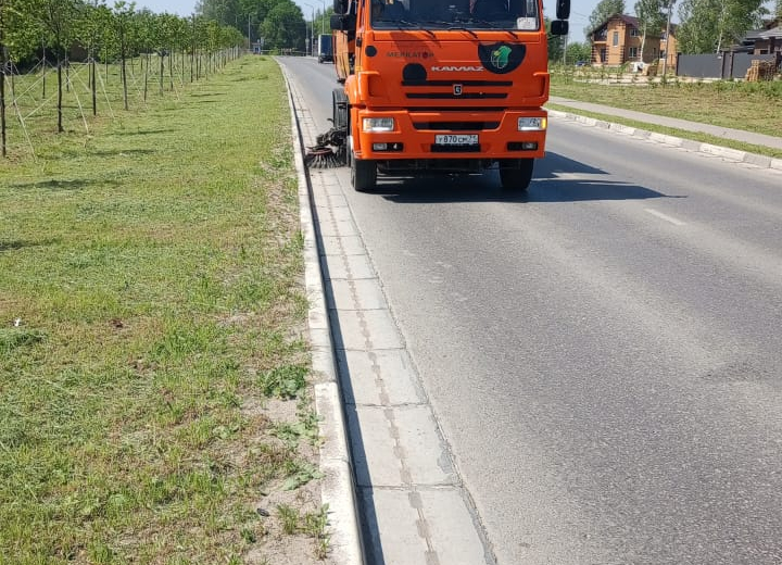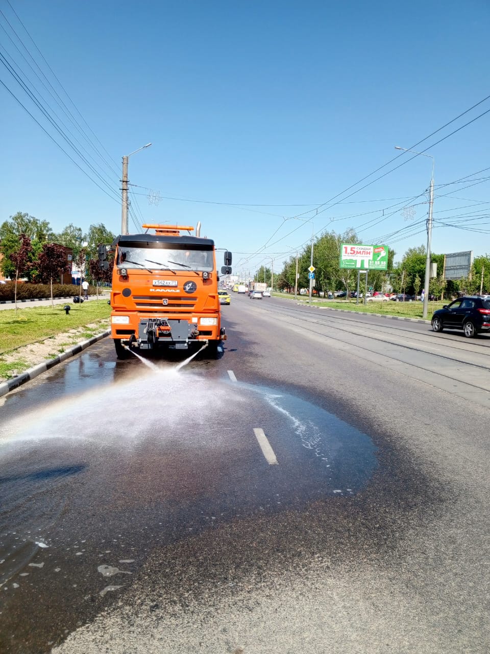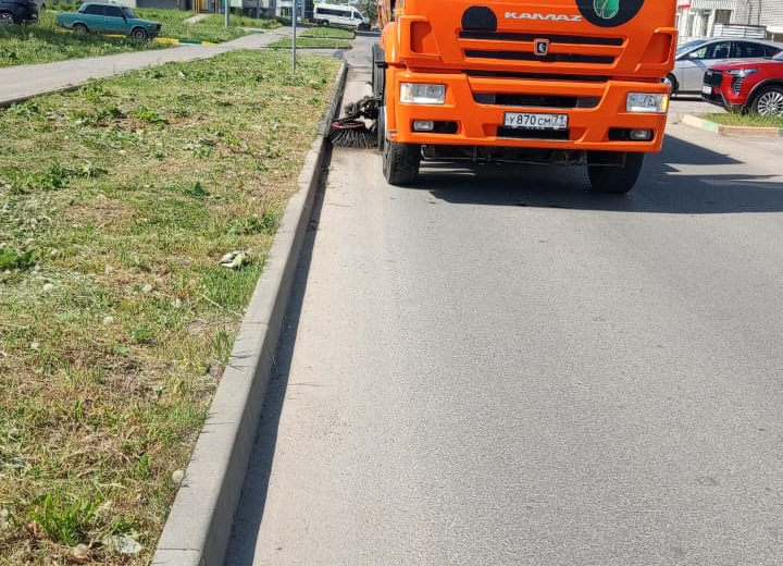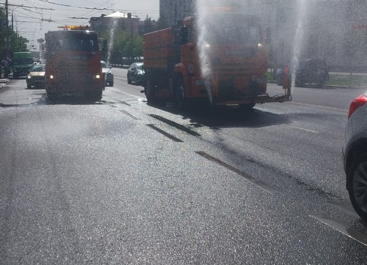 На дорогах подметание выполняют при помощи ВПМ и прицепных устройств «Скандия». Из-за жары кратность мойки проезжей части с помощью КДМ увеличили.