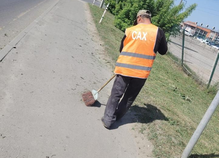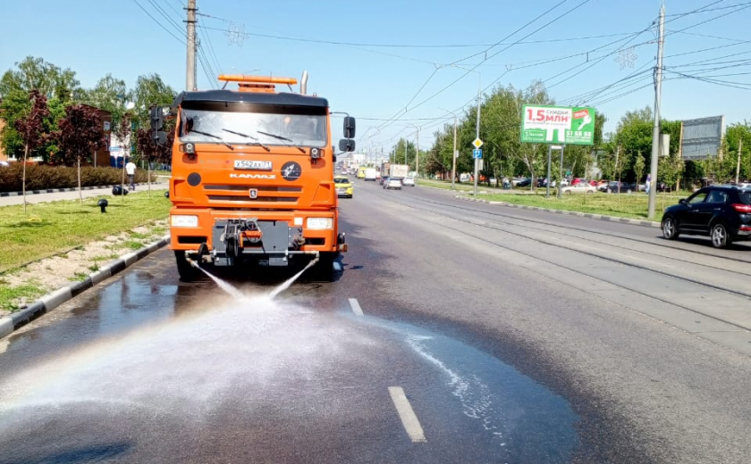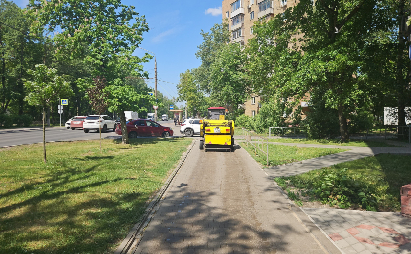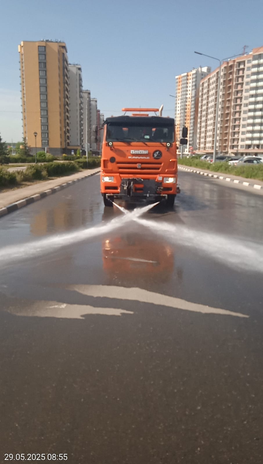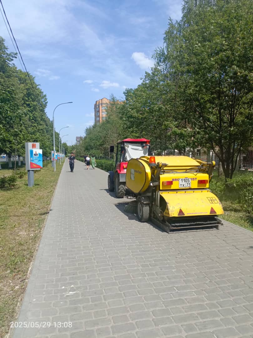 На дорогах подметание выполняют при помощи ВПМ и прицепных устройств «Скандия». Из-за жары кратность мойки проезжей части с помощью КДМ увеличили.