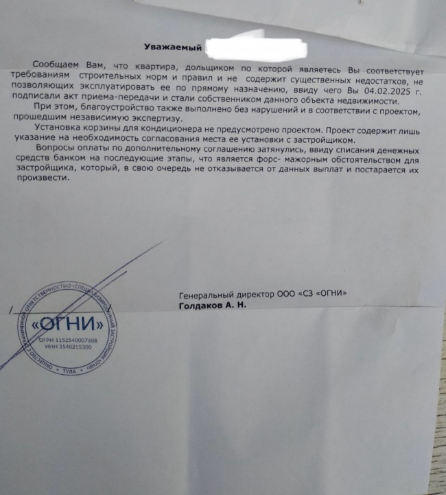 «Много обещаний, задержка сдачи на год, компенсации не выплачены, недоделки в подъездах — нет номеров этажей, почтовых ящиков, — делятся туляки. — А управляющая компания, кажется, просто связана с застройщиком».