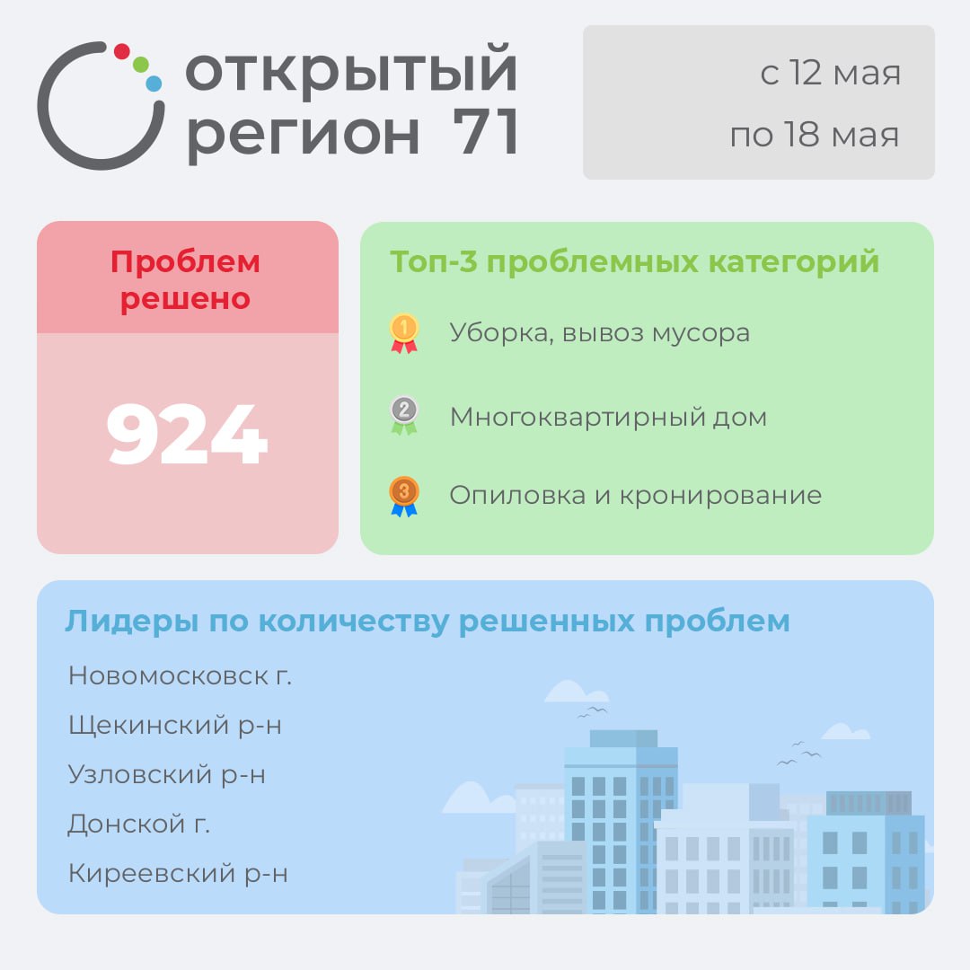 Туляки за неделю решили 924 проблемы с помощью портала «Открытый регион 71». Об этом сообщает региональное министерство цифрового развития и связи. Данные приводятся за период с 12 по 18 мая.