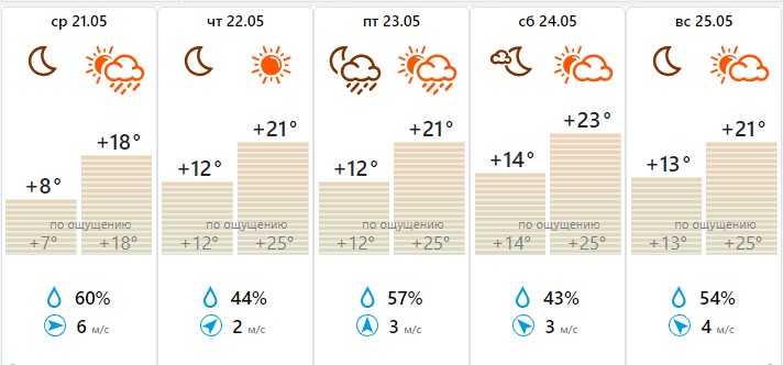 При этом возможны кратковременные грозовые дожди в среду, 21 мая, и в воскресенье, 25 мая. Уже с пятницы столбики термометров со средних +19 поднимутся до +24…+26 градусов.