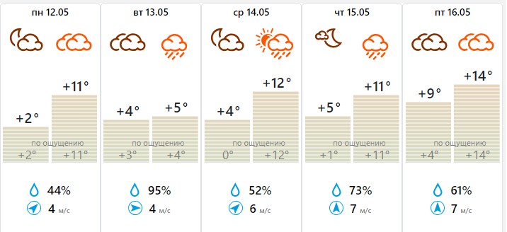 Начиная с 12 мая, температура ночью здесь может упасть до -2…+5 градусов. А в Центральной России ожидаются заморозки сразу до -5 градусов. Не обойдется и без осадков — возможны дожди. Днем же температура не превысит +7…+12 градусов.
