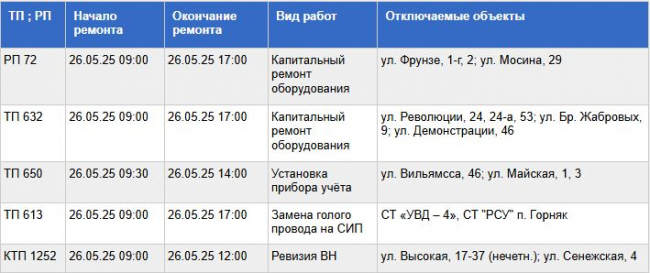 В большинстве случаев свет начнут отключать в 09:00, а возвращать — в 17:00. Все отключения связаны с капремонтом, установкой прибора учета и другими работами. Подробный график и список адресов — в таблице: