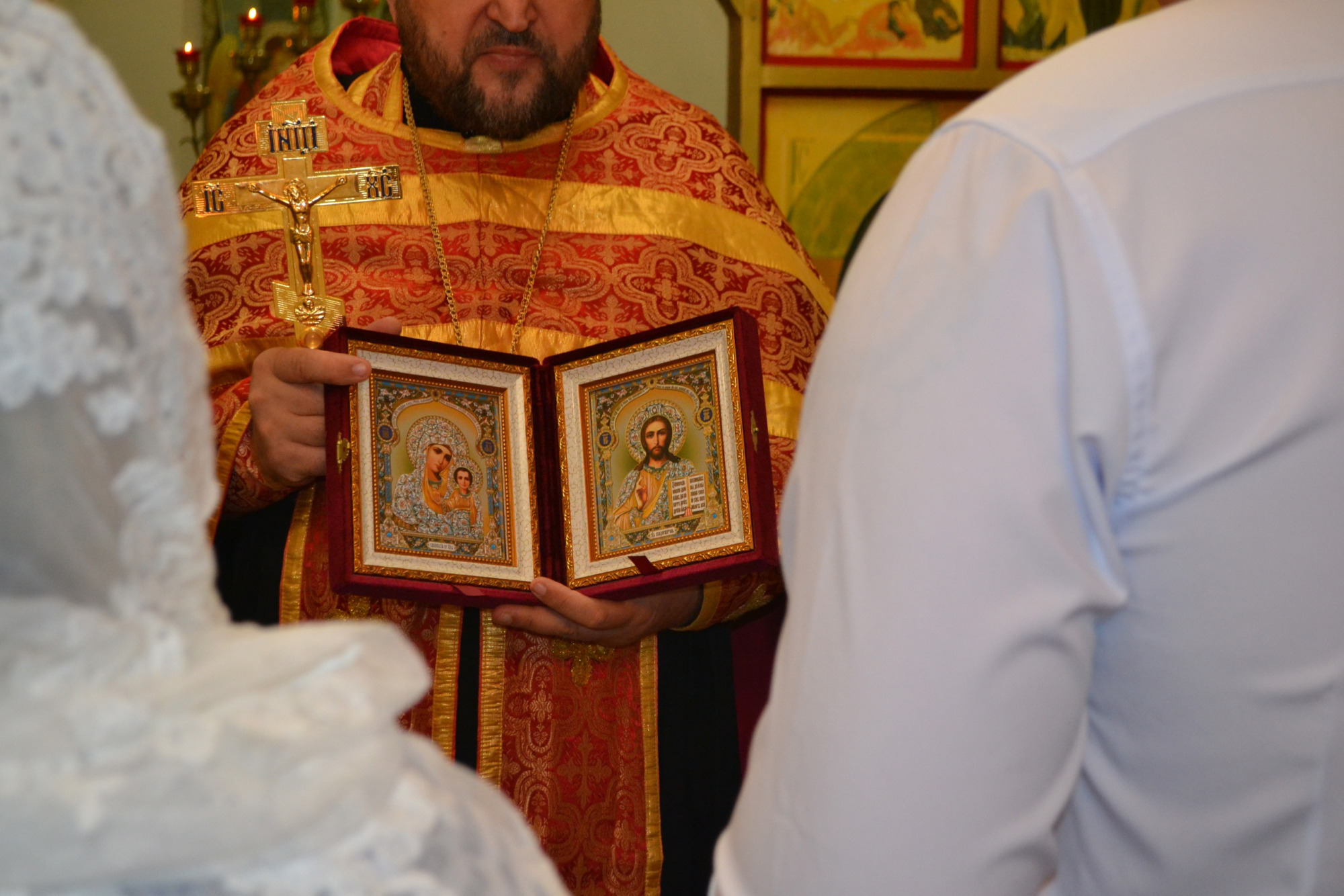Таинство совершил иерей храма святого великомученика Георгия Победоносца отец Александр Суворин. Перед этим молодожены прошли подготовительный этап: исповедовались, причастились и побеседовали со священнослужителем. Сама церемония прошла в торжественной обстановке с золочеными венцами, венчальными свечами и рушником.