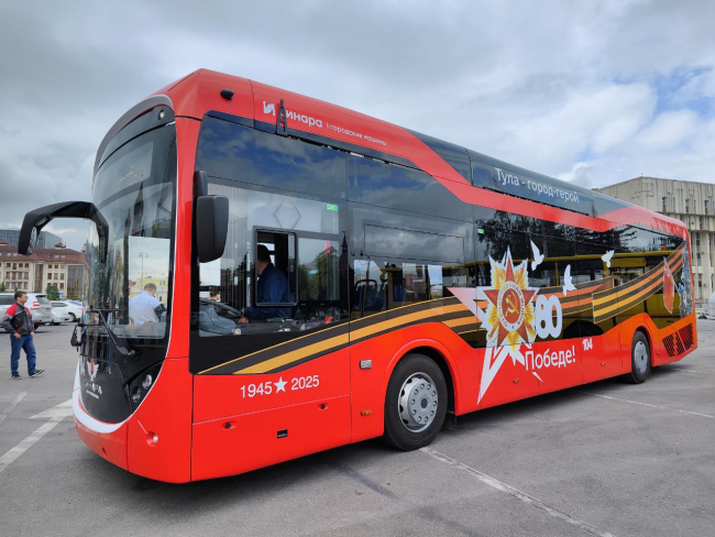 Специально для Тулы экстерьер троллейбуса выполнен в красном цвете и украшен в честь 80-й годовщины Победы в Великой Отечественной войне. А наверху есть надпись «Тула — город-герой».