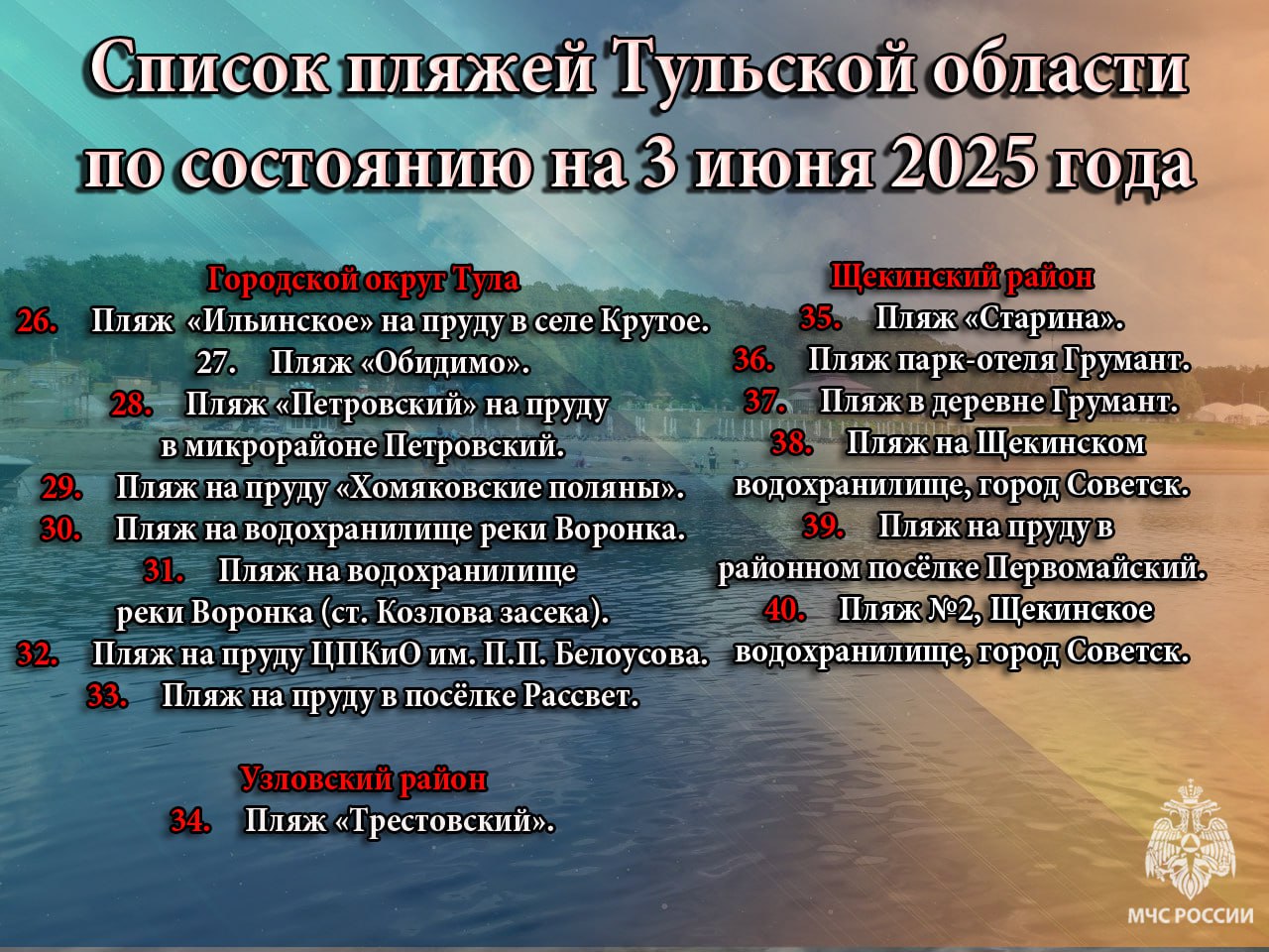 Региональное управление МЧС опубликовало список официальных пляжей в Тульской области. По данным на 3 июня, открыто 40 зон отдыха, в том числе восемь в оружейной столице. Но их список еще будет пополняться.