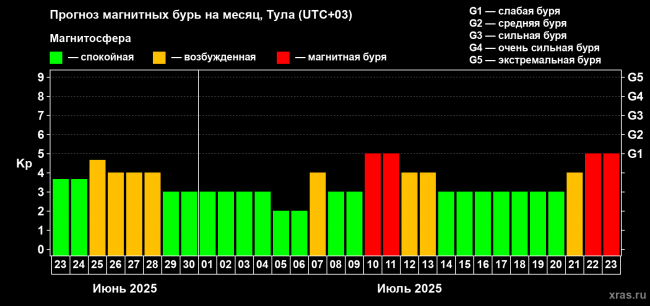 Начало июля будет относительно спокойным: магнитное поле Земли останется стабильным, а уровень возмущений — минимальным. Однако уже в конце июня туляки могут ощутить на себе влияние слабых магнитных возмущений, которые ожидаются с 25-го по 28-е число.