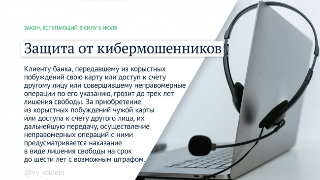 Теперь передача банковской карты (или банковского счета) мошенникам наказуема штрафами, обязательными или принудительными работами до шести лет, в зависимости от обстоятельств и суммы. Например, если человек отдает преступнику свою карту за вознаграждение, то его могут оштрафовать на сумму до трехсот тысяч рублей либо лишить свободы на срок до трех лет. Если карта была оформлена для преступных действий специально, то наказание будет строже: штраф до миллиона рублей или до шести лет тюрьмы.