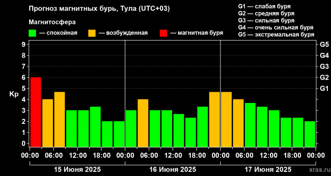 Магнитные бури уровня G1 считаются самыми слабыми, уровень G3 — сильная буря, которая вызывает перебои в спутниковой навигации и радиосвязи.