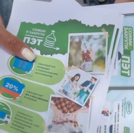 Ребята призвали жителей принять участие в проекте ООО «МСК-НТ» и сформировать новую экопривычку «Сожми и закрути ПЭТ». Благодаря сжатию ПЭТ сохраняется значительное пространство не только в контейнере на улице, но и освобождается место в ведрах самих жителей. Еще благодаря сжатому пластику мусор не вываливается из контейнеров, при этом забирающий его мусоровоз загружается полнее.