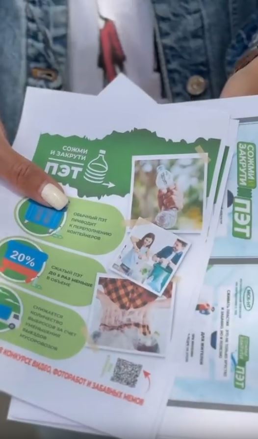 Ребята призвали жителей принять участие в проекте ООО «МСК-НТ» и сформировать новую экопривычку «Сожми и закрути ПЭТ». Благодаря сжатию ПЭТ сохраняется значительное пространство не только в контейнере на улице, но и освобождается место в ведрах самих жителей. Еще благодаря сжатому пластику мусор не вываливается из контейнеров, при этом забирающий его мусоровоз загружается полнее.