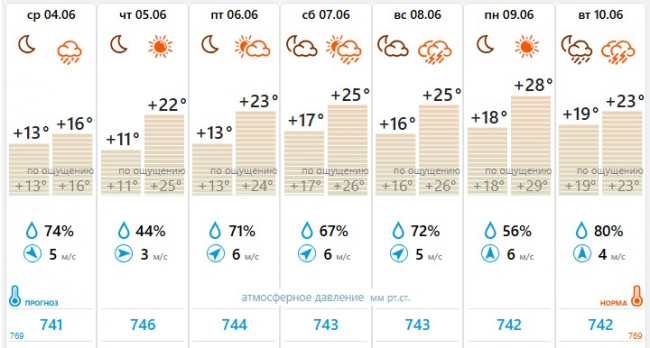 Затем кучево-дождевых облаков станет меньше. Температура начнет расти, воздух прогреваться — и к воскресенью столбики термометров покажут +28 градусов, что для начала июня является аномалией примерно на семь градусов.